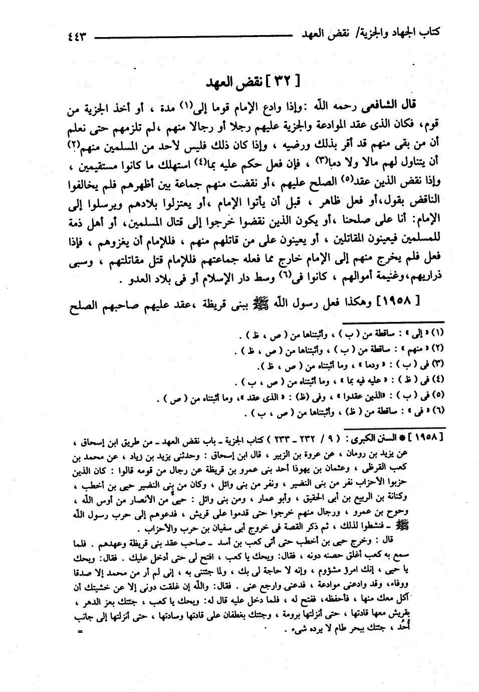 قَالَ الشَّافِعِيُّ : رحمه الله تعالى وَإِذَا وَادَعَ الْإِمَامُ قَوْمًا مُدَّةً , أَوْ أَخَذَ الْجِزْيَةَ مِنْ قَوْمٍ فَكَانَ الَّذِي عَقَدَ الْمُوَادَعَةَ وَالْجِزْيَةَ عَلَيْهِمْ رَجُلاً , أَوْ رِجَالاً مِنْهُمْ لَمْ تَلْزَمْهُمْ حَتَّى نَعْلَمَ أَنَّ مَنْ بَقِيَ مِنْهُمْ قَدْ أَقَرَّ بِذَلِكَ وَرَضِيَهُ , وَإِذَا كَانَ ذَلِكَ فَلَيْسَ لِأَحَدٍ مِنْ الْمُسْلِمِينَ أَنْ يَتَنَاوَلَ لَهُمْ مَالاً وَدَمًا , فَإِنْ فَعَلَ حَكَمَ عَلَيْهِ بِمَا اسْتَهْلَكَ مَا كَانُوا مُسْتَقِيمِينَ , وَإِذَا نَقَضَ الَّذِينَ عَقَدُوا الصُّلْحَ عَلَيْهِمْ , أَوْ نَقَضَتْ مِنْهُمْ جَمَاعَةٌ بَيْنَ أَظْهُرِهِمْ فَلَمْ يُخَالِفُوا النَّاقِضَ بِقَوْلٍ , أَوْ فِعْلٍ ظَاهِرٍ قَبْلَ أَنْ يَأْتُوا الْإِمَامَ , أَوْ يَعْتَزِلُوا بِلاَدَهُمْ وَيُرْسِلُوا إلَى الْإِمَامِ إنَّا عَلَى صُلْحِنَا , أَوْ يَكُونَ الَّذِينَ نَقَضُوا خَرَجُوا إلَى قِتَالِ الْمُسْلِمِينَ , أَوْ أَهْلِ ذِمَّةٍ لِلْمُسْلِمِينَ فَيُعِينُونَ الْمُقَاتِلِينَ , أَوْ يُعِينُونَ عَلَى مَنْ قَاتَلَهُمْ مِنْهُمْ فَلِلْإِمَامِ أَنْ يَغْزُوَهُمْ , فَإِذَا فَعَلَ فَلَمْ يَخْرُجْ مِنْهُمْ إلَى الْإِمَامِ خَارِجٌ مِمَّا فَعَلَهُ جَمَاعَتُهُمْ فَلِلْإِمَامِ قَتْلُ مُقَاتِلَتِهِمْ وَسَبْيُ ذَرَارِيِّهِمْ وَغَنِيمَةُ أَمْوَالِهِمْ كَانُوا فِي وَسَطِ دَارِ الْإِسْلاَمِ , أَوْ فِي بِلاَدِ الْعَدُوِّ . وَهَكَذَا { فَعَلَ رَسُولُ اللَّهِ - صلى الله عليه وسلم - بِبَنِي قُرَيْظَةَ عَقَدَ عَلَيْهِمْ صَاحِبُهُمْ الصُّلْحَ @