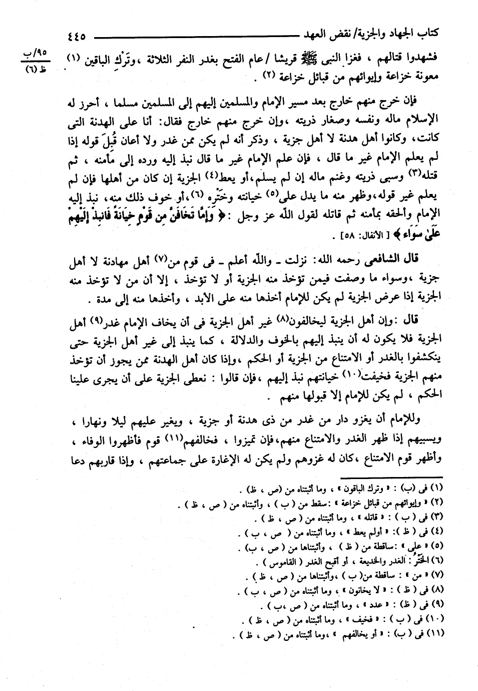 قَالَ الشَّافِعِيُّ : رحمه الله تعالى نَزَلَتْ وَاَللَّهُ تَعَالَى أَعْلَمُ فِي قَوْمٍ أَهْلِ مُهَادَنَةٍ لاَ أَهْلِ جِزْيَةٍ , وَسَوَاءٌ مَا وَصَفْت فِيمَنْ تُؤْخَذُ مِنْهُ الْجِزْيَةُ , أَوْ لاَ تُؤْخَذُ إلَّا أَنَّ مَنْ لاَ تُؤْخَذُ مِنْهُ الْجِزْيَةُ إذَا عَرَضَ الْجِزْيَةَ لَمْ يَكُنْ لِلْإِمَامِ أَخْذُهَا مِنْهُ عَلَى الْأَبَدِ وَأَخَذَهَا مِنْهُ إلَى مُدَّةٍ , قَالَ : وَإِنَّ أَهْلَ الْجِزْيَةِ لَيُخَالِفُونَ غَيْرَ أَهْلِ الْجِزْيَةِ فِي أَنْ يَخَافَ الْإِمَامُ غَدْرَ أَهْلِ الْجِزْيَةِ فَلاَ يَكُونُ لَهُ أَنْ يَنْبِذَ إلَيْهِمْ بِالْخَوْفِ وَالدَّلاَلَةِ كَمَا يَنْبِذُ إلَى غَيْرِ أَهْلِ الْجِزْيَةِ حَتَّى يَنْكَشِفُوا بِالْغَدْرِ , أَوْ الِامْتِنَاعِ مِنْ الْجِزْيَةِ أَوْ الْحُكْمِ .
