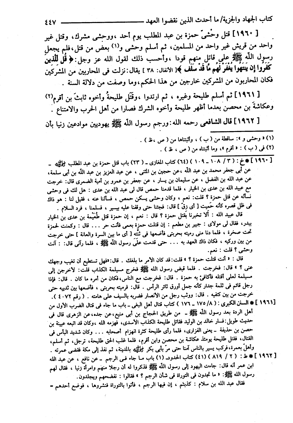 قَتَلَ وَحْشِيٌّ حَمْزَةَ بْنَ عَبْدِ الْمُطَّلِبِ يَوْمَ أُحُدٍ وَوَحْشِيٌّ مُشْرِكٌ , وَقَتَلَ غَيْرُ وَاحِدٍ مِنْ قُرَيْشٍ غَيْرَ وَاحِدٍ مِنْ الْمُسْلِمِينَ ثُمَّ أَسْلَمَ بَعْضُ مَنْ قَتَلَ فَلَمْ يَجْعَلْ رَسُولُ اللَّهِ - صلى الله عليه وسلم - عَلَى قَاتِلٍ مِنْهُمْ قَوَدًا وَأَحْسِبُ ذَلِكَ لِقَوْلِ اللَّهِ عَزَّ وَجَلَّ : ? قُلْ لِلَّذِينَ كَفَرُوا إنْ يَنْتَهُوا يُغْفَرْ لَهُمْ مَا قَدْ سَلَفَ } يُقَالُ نَزَلَتْ فِي الْمُحَارِبِينَ مِنْ الْمُشْرِكِينَ فَكَانَ الْمُحَارِبُونَ مِنْ الْمُشْرِكِينَ خَارِجِينَ مِنْ هَذَا الْحُكْمِ وَمَا وَصَفْت مِنْ دَلاَلَةِ السُّنَّةِ ثُمَّ أَسْلَمَ طُلَيْحَةُ وَغَيْرُهُ ثُمَّ ارْتَدُّوا وَقَتَلَ طُلَيْحَةَ وَأَخُوهُ ثَابِتُ بْنُ أَفْرَمَ وَعُكَاشَةُ بْنُ مِحْصَنٍ بَعْدَمَا أَظْهَرَ طُلَيْحَةُ وَأَخُوهُ الشِّرْكَ فَصَارَا مِنْ أَهْلِ الْحَرْبِ وَالِامْتِنَاعِ .