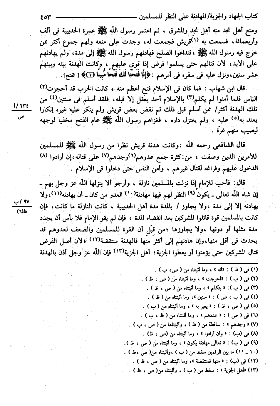قَالَ الشَّافِعِيُّ : رحمه الله تعالى وَكَانَتْ هُدْنَةُ قُرَيْشٍ نَظَرًا مِنْ رَسُولِ اللَّهِ - صلى الله عليه وسلم - لِلْمُسْلِمِينَ لِلْأَمْرَيْنِ اللَّذَيْنِ وَصَفْتُ مِنْ كَثْرَةِ جَمْعِ عَدُوِّهِمْ وَجَدِّهِمْ عَلَى قِتَالِهِ , وَإِنْ أَرَادُوا الدُّخُولَ عَلَيْهِمْ وَفَرَاغَهُ لِقِتَالِ غَيْرِهِمْ وَأَمِنَ النَّاسُ حَتَّى دَخَلُوا فِي الْإِسْلاَمِ قَالَ : فَأُحِبُّ لِلْإِمَامِ إذَا نَزَلَتْ بِالْمُسْلِمِينَ نَازِلَةٌ وَأَرْجُو أَنْ لاَ يُنْزِلَهَا اللَّهُ عَزَّ وَجَلَّ بِهِمْ إنْ شَاءَ اللَّهُ تَعَالَى مُهَادَنَةً يَكُونُ النَّظَرُ لَهُمْ فِيهَا , وَلاَ يُهَادِنُ إلَّا إلَى مُدَّةٍ , وَلاَ يُجَاوِزُ بِالْمُدَّةِ مُدَّةَ أَهْلِ الْحُدَيْبِيَةِ كَانَتْ النَّازِلَةُ مَا كَانَتْ فَإِنْ كَانَتْ بِالْمُسْلِمِينَ قُوَّةٌ قَاتَلُوا الْمُشْرِكِينَ بَعْدَ انْقِضَاءِ الْمُدَّةِ فَإِنْ لَمْ يَقْوَ الْإِمَامُ فَلاَ بَأْسَ أَنْ يُجَدِّدَ مُدَّةً مِثْلَهَا أَوْ دُونَهَا , وَلاَ يُجَاوِزُهَا مِنْ قِبَلِ أَنَّ الْقُوَّةَ لِلْمُسْلِمِينَ وَالضَّعْفَ لِعَدُوِّهِمْ قَدْ يَحْدُثُ فِي أَقَلَّ مِنْهَا , وَإِنْ هَادَنَهُمْ إلَى أَكْثَرَ مِنْهَا فَمُنْتَقَضَةٌ ; لِأَنَّ أَصْلَ الْفَرْضِ قِتَالُ الْمُشْرِكِينَ حِينَ يُؤْمِنُوا , أَوْ يُعْطُوا الْجِزْيَةَ , فَإِنَّ اللَّهَ عَزَّ وَجَلَّ أَذِنَ بِالْهُدْنَةِ @