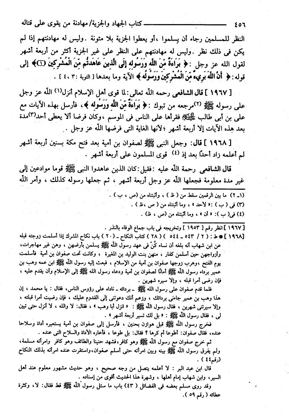 قَالَ الشَّافِعِيُّ : رحمه الله تعالى { لَمَّا قَوِيَ أَهْلُ الْإِسْلاَمِ أَنْزَلَ اللَّهُ عَزَّ وَجَلَّ عَلَى رَسُولِهِ - صلى الله عليه وسلم - مَرْجِعَهُ مِنْ تَبُوكَ { بَرَاءَةٌ مِنْ اللَّهِ وَرَسُولِهِ } فَأَرْسَلَ بِهَذِهِ الْآيَاتِ مَعَ عَلِيِّ بْنِ أَبِي طَالِبٍ رضي الله تعالى عنه فَقَرَأَهَا عَلَى النَّاسِ فِي الْمَوْسِمِ وَكَانَ فَرْضًا أَنْ لاَ يُعْطِيَ لِأَحَدٍ مُدَّةً بَعْدَ هَذِهِ الْآيَاتِ إلَّا أَرْبَعَةَ أَشْهُرٍ } ; لِأَنَّهَا الْغَايَةُ الَّتِي فَرَضَهَا اللَّهُ عَزَّ وَجَلَّ قَالَ : { وَجَعَلَ النَّبِيُّ - صلى الله عليه وسلم - لِصَفْوَانَ بْنِ أُمَيَّةَ بَعْدَ فَتْحِ مَكَّةَ بِسِنِينَ أَرْبَعَةَ أَشْهُرٍ } لَمْ أَعْلَمْهُ زَادَ أَحَدًا بَعْدَ أَنْ قَوِيَ الْمُسْلِمُونَ عَلَى أَرْبَعَةِ أَشْهُرٍ .
