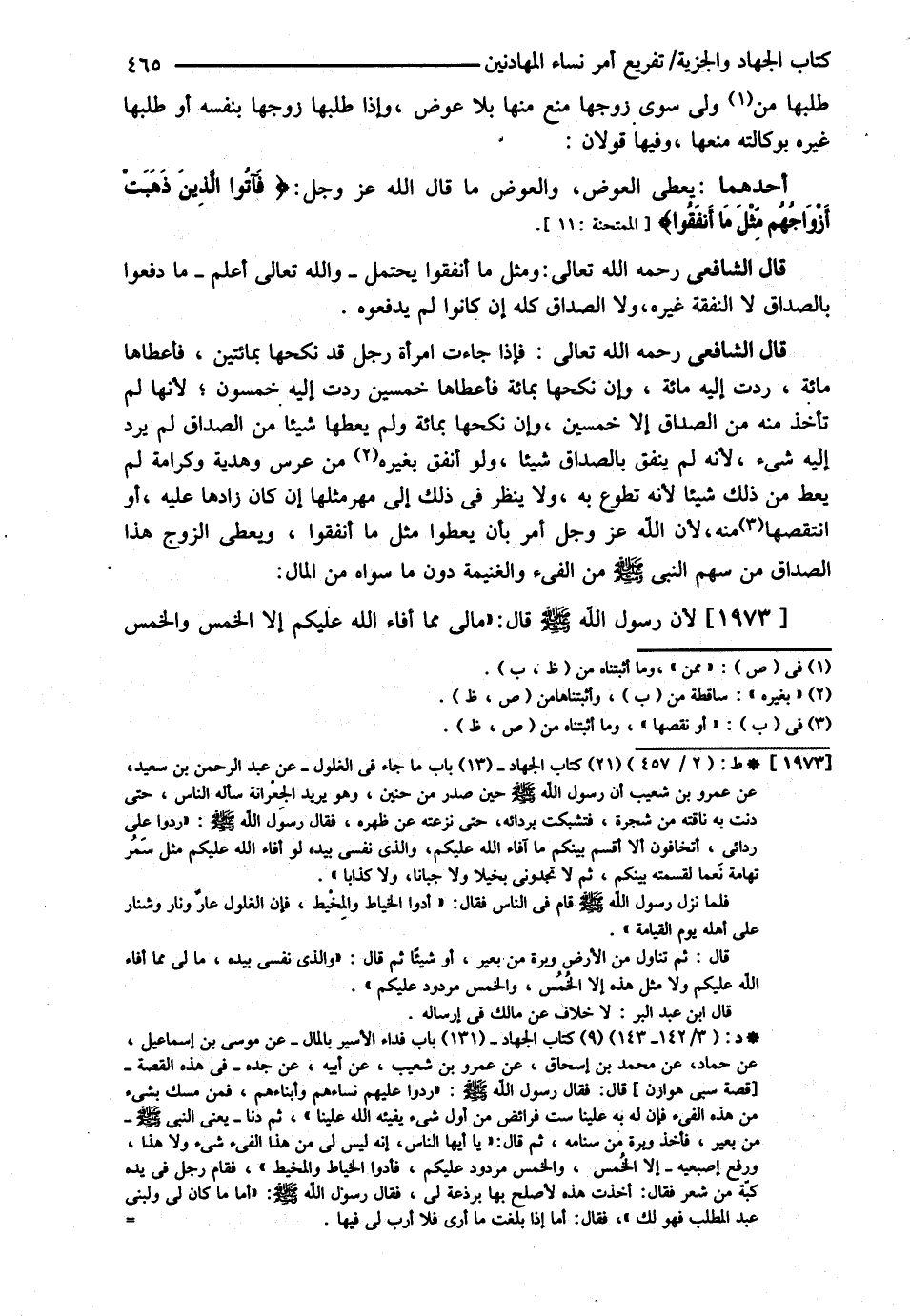 قَالَ الشَّافِعِيُّ : رحمه الله تعالى فَإِذَا جَاءَتْ امْرَأَةُ رَجُلٍ قَدْ نَكَحَهَا بِمِائَتَيْنِ فَأَعْطَاهَا مِائَةً رُدَّتْ إلَيْهِ مِائَةٌ , وَإِنْ نَكَحَهَا بِمِائَةٍ فَأَعْطَاهَا خَمْسِينَ رُدَّتْ إلَيْهِ خَمْسُونَ ; لِأَنَّهَا لَمْ تَأْخُذْ مِنْهُ مِنْ الصَّدَاقِ إلَّا خَمْسِينَ , وَإِنْ نَكَحَهَا بِمِائَةٍ , وَلَمْ يُعْطِهَا شَيْئًا مِنْ الصَّدَاقِ لَمْ تَرُدَّ إلَيْهِ شَيْئًا ; لِأَنَّهُ لَمْ يُنْفِقْ بِالصَّدَاقِ شَيْئًا , وَلَوْ أَنْفَقَ مِنْ عُرْسٍ وَهَدِيَّةٍ وَكَرَامَةٍ لَمْ يُعْطِ مِنْ ذَلِكَ شَيْئًا لِأَنَّهُ تَطَوَّعَ بِهِ , وَلاَ يُنْظَرُ فِي ذَلِكَ إلَى مَهْرِ مِثْلِهَا إنْ كَانَ زَادَهَا عَلَيْهِ , أَوْ نَقَصَهَا مِنْهُ ; لِأَنَّ اللَّهَ عَزَّ وَجَلَّ أَمَرَ بِأَنْ يُعْطُوا مِثْلَ مَا أَنْفَقُوا وَيُعْطِي الزَّوْجُ هَذَا الصَّدَاقَ مِنْ سَهْمِ النَّبِيِّ - صلى الله عليه وسلم - مِنْ الْفَيْءِ وَالْغَنِيمَةِ دُونَ مَا سِوَاهُ مِنْ الْمَالِ ; لِأَنَّ رَسُولَ اللَّهِ - صلى الله عليه وسلم - قَالَ : { مَا لِي مِمَّا أَفَاءَ اللَّهُ عَلَيْكُمْ إلَّا الْخُمُسُ وَالْخُمُسُ@