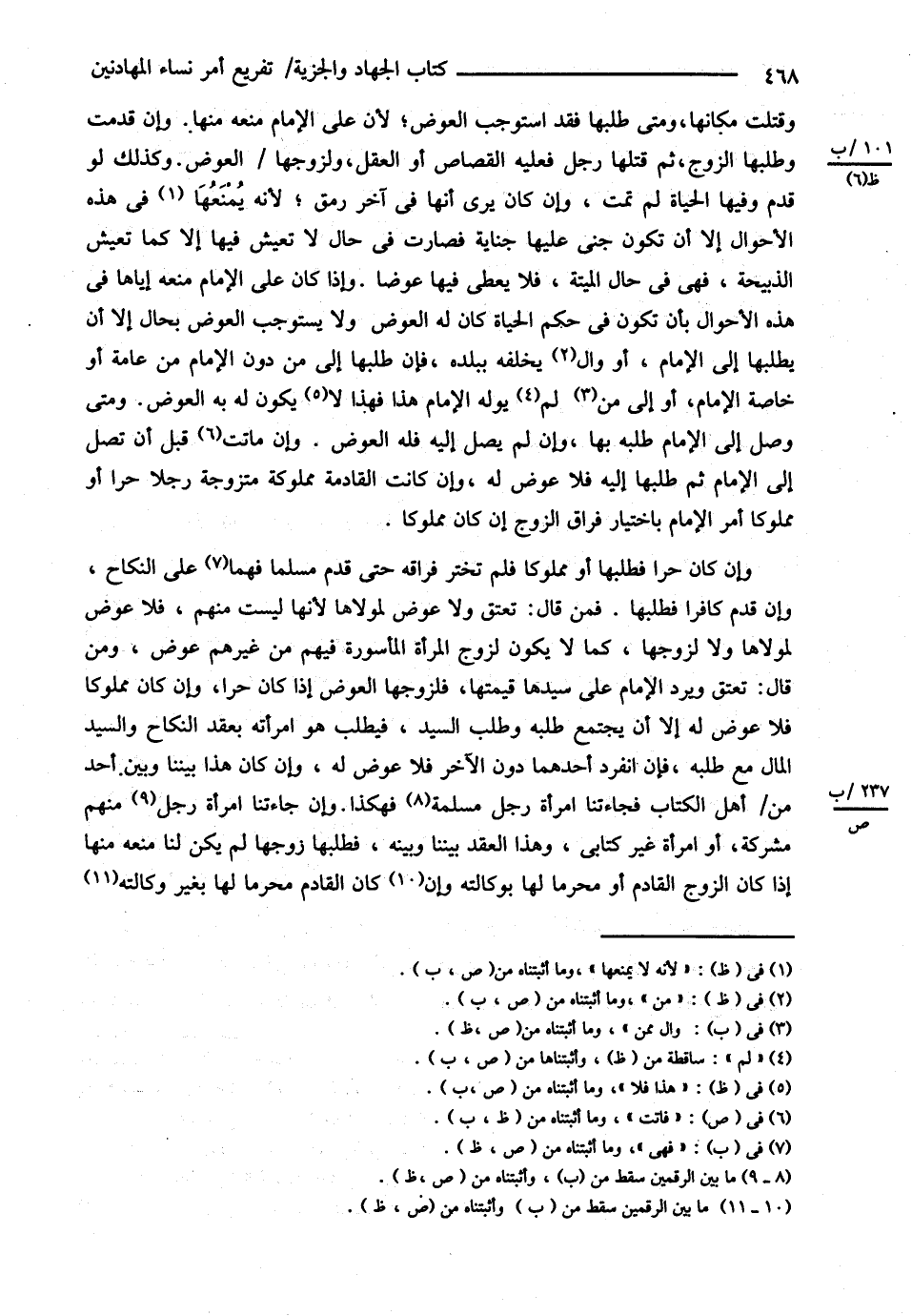 وَإِنْ كَانَ حُرًّا فَطَلَبَهَا , أَوْ مَمْلُوكًا فَلَمْ تَخْتَرْ فِرَاقَهُ حَتَّى قَدِمَ مُسْلِمًا فَهِيَ عَلَى النِّكَاحِ , وَإِنْ قَدِمَ كَافِرًا فَطَلَبَهَا فَمَنْ قَالَ : تُعْتَقُ , وَلاَ عِوَضَ لِمَوْلاَهَا ; لِأَنَّهَا لَيْسَتْ مِنْهُمْ فَلاَ عِوَضَ لِمَوْلاَهَا , وَلاَ لِزَوْجِهَا كَمَا لاَ يَكُونُ لِزَوْجِ الْمَرْأَةِ الْمَأْسُورَةِ فِيهِمْ مِنْ غَيْرِهِمْ عِوَضٌ , وَمَنْ قَالَ تُعْتَقُ وَيَرُدُّ الْإِمَامُ عَلَى سَيِّدِهَا قِيمَتَهَا فَلِزَوْجِهَا الْعِوَضُ إذَا كَانَ حُرًّا , وَإِنْ كَانَ مَمْلُوكًا فَلاَ عِوَضَ لَهُ إلَّا أَنْ يَجْتَمِعَ طَلَبُهُ وَطَلَبُ السَّيِّدِ فَيَطْلُبُ هُوَ امْرَأَتَهُ بِعَقْدِ النِّكَاحِ وَالسَّيِّدُ الْمَالَ مَعَ طَلَبِهِ , فَإِنْ انْفَرَدَ أَحَدُهُمَا دُونَ الْآخَرِ فَلاَ عِوَضَ لَهُ . وَإِنْ كَانَ هَذَا بَيْنَنَا وَبَيْنَ أَحَدٍ مِنْ أَهْلِ الْكِتَابِ فَجَاءَتْنَا امْرَأَةُ رَجُلٍ مِنْهُمْ مُشْرِكَةً , أَوْ امْرَأَةُ غَيْرِ كِتَابِيٍّ , وَهَذَا الْعَقْدُ بَيْنَنَا وَبَيْنَهُ فَطَلَبَهَا زَوْجُهَا لَمْ يَكُنْ لَنَا مَنْعُهُ مِنْهَا إذَا كَانَ الزَّوْجُ الْقَادِمُ أَوْ مَحْرَمًا لَهَا بِوَكَالَتِهِ@