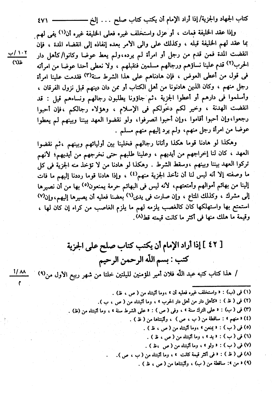 إذَا أَرَادَ الْإِمَامُ أَنْ يَكْتُبَ كِتَابَ صُلْحٍ عَلَى الْجِزْيَةِ كَتَبَ : بسم الله الرحمن الرحيم هَذَا كِتَابٌ كَتَبَهُ عَبْدُ اللَّهِ فُلاَنٌ أَمِيرُ الْمُؤْمِنِينَ لِلَّيْلَتَيْنِ خَلَتَا مِنْ شَهْرِ رَبِيعِ الْأَوَّلِ @