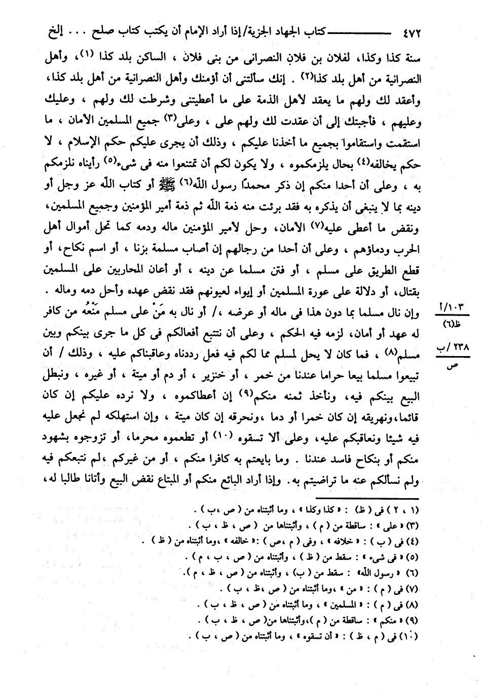 سَنَةَ كَذَا وَكَذَا لِفُلاَنِ بْنِ فُلاَنٍ النَّصْرَانِيِّ مِنْ بَنِي فُلاَنٍ السَّاكِنِ بَلَدَ كَذَا وَأَهْلُ النَّصْرَانِيَّةِ مِنْ أَهْلِ بَلَدِ كَذَا إنَّك سَأَلْتَنِي أَنْ أُؤَمِّنَك وَأَهْلَ النَّصْرَانِيَّةِ مِنْ أَهْلِ بَلَدِ كَذَا وَأَعْقِدَ لَك وَلَهُمْ مَا يُعْقَدُ لِأَهْلِ الذَّمَّةِ عَلَى مَا أَعْطَيْتنِي وَشَرَطْتُ لَك وَلَهُمْ وَعَلَيْك وَعَلَيْهِمْ فَأَجَبْتُك إلَى أَنْ عَقَدْت لَك وَلَهُمْ عَلَيَّ وَعَلَى جَمِيعِ الْمُسْلِمِينَ الْأَمَانُ مَا اسْتَقَمْتَ وَاسْتَقَامُوا بِجَمِيعِ مَا أَخَذْنَا عَلَيْكُمْ وَذَلِكَ أَنْ يَجْرِيَ عَلَيْكُمْ حُكْمُ الْإِسْلاَمِ لاَ حُكْمُ خِلاَفِهِ بِحَالٍ يُلْزِمُكُمُوهُ , وَلاَ يَكُونُ لَكُمْ أَنْ تَمْتَنِعُوا مِنْهُ فِي شَيْءٍ رَأَيْنَاهُ نُلْزِمُكُمْ بِهِ وَعَلَى أَنَّ أَحَدًا مِنْكُمْ إنْ ذَكَرَ مُحَمَّدًا - صلى الله عليه وسلم - أَوْ كِتَابَ اللَّهِ عَزَّ وَجَلَّ أَوْ دِينَهُ بِمَا لاَ يَنْبَغِي أَنْ يَذْكُرَهُ بِهِ , فَقَدْ بَرِئَتْ مِنْهُ ذِمَّةُ اللَّهِ ثُمَّ ذِمَّةُ أَمِيرِ الْمُؤْمِنِينَ وَجَمِيعُ الْمُسْلِمِينَ وَنَقَضَ مَا أُعْطِيَ عَلَيْهِ الْأَمَانُ وَحَلَّ لِأَمِيرِ الْمُؤْمِنِينَ مَالُهُ وَدَمُهُ كَمَا تَحِلُّ أَمْوَالُ أَهْلِ الْحَرْبِ دِمَاؤُهُمْ. وَعَلَى أَنَّ أَحَدًا مِنْ رِجَالِكُمْ إنْ أَصَابَ مُسْلِمَةً بِزِنًا , أَوْ اسْمِ نِكَاحٍ أَوْ قَطَعَ الطَّرِيقِ عَلَى مُسْلِمٍ , أَوْ فَتَنَ مُسْلِمًا عَنْ دِينِهِ , أَوْ أَعَانَ الْمُحَارِبِينَ عَلَى الْمُسْلِمِينَ بِقِتَالٍ , أَوْ دَلاَلَةٍ عَلَى عَوْرَةِ الْمُسْلِمِينَ وَإِيوَاءٍ لِعُيُونِهِمْ , فَقَدْ نَقَضَ عَهْدَهُ وَأَحَلَّ دَمَهُ وَمَالَهُ , وَإِنْ نَالَ مُسْلِمًا بِمَا دُونَ هَذَا فِي مَالِهِ أَوْ عِرْضِهِ , أَوْ نَالَ بِهِ مَنْ عَلَى مُسْلِمٍ مَنْعُهُ مِنْ كَافِرٍ لَهُ عَهْدٌ , أَوْ أَمَانٌ لَزِمَهُ فِيهِ الْحُكْمُ وَعَلَى أَنْ نَتَتَبَّعَ أَفْعَالَكُمْ فِي كُلِّ مَا جَرَى بَيْنَكُمْ وَبَيْنَ مُسْلِمٍ فَمَا كَانَ لاَ يَحِلُّ لِمُسْلِمٍ مِمَّا لَكُمْ فِيهِ فِعْلٌ رَدَدْنَاهُ وَعَاقَبْنَاكُمْ عَلَيْهِ وَذَلِكَ أَنْ تَبِيعُوا مُسْلِمًا بَيْعًا حَرَامًا عِنْدَنَا مِنْ خَمْرٍ , أَوْ خِنْزِيرٍ , أَوْ دَمِ مَيْتَةٍ أَوْ غَيْرِهِ وَنُبْطِلُ الْبَيْعَ بَيْنَكُمْ فِيهِ وَنَأْخُذُ ثَمَنَهُ مِنْكُمْ إنْ أَعْطَاكُمُوهُ , وَلاَ نَرُدُّهُ عَلَيْكُمْ إنْ كَانَ قَائِمًا ونهريقه إنْ كَانَ خَمْرًا , أَوْ دَمًا وَنُحَرِّقهُ إنْ كَانَ مَيْتَةً , وَإِنْ اسْتَهْلَكَهُ لَمْ نَجْعَلْ عَلَيْهِ فِيهِ شَيْئًا وَنُعَاقِبْكُمْ عَلَيْهِ , وَعَلَى أَنْ لاَ تُسْقُوهُ , أَوْ تُطْعِمُوهُ مُحَرَّمًا أَوْ تُزَوِّجُوهُ بِشُهُودٍ مِنْكُمْ , أَوْ بِنِكَاحٍ فَاسِدٍ عِنْدَنَا وَمَا بَايَعْتُمْ بِهِ كَافِرًا مِنْكُمْ , أَوْ مِنْ غَيْرِكُمْ لَمْ نَتَّبِعْكُمْ فِيهِ , وَلَمْ نَسْأَلْكُمْ عَنْهُ مَا تَرَاضَيْتُمْ بِهِ. وَإِذَا أَرَادَ الْبَائِعُ مِنْكُمْ , أَوْ الْمُبْتَاعُ نَقْضَ الْبَيْعِ وَأَتَانَا طَالِبًا لَهُ@