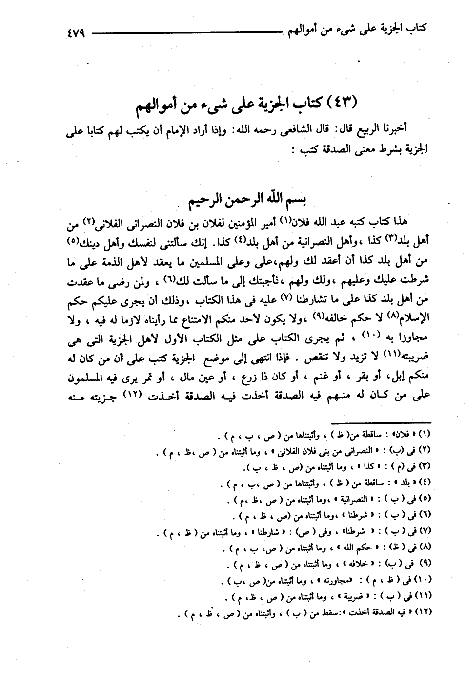 كِتَابُ الْجِزْيَةِ عَلَى شَيْءٍ مِنْ أَمْوَالِهِمْ (أَخْبَرَنَا الرَّبِيعُ) قَالَ (أَخْبَرَنَا الشَّافِعِيُّ) وَإِذَا أَرَادَ الْإِمَامُ أَنْ يَكْتُبَ لَهُمْ كِتَابًا عَلَى الْجِزْيَةِ بِشَرْطِ مَعْنَى الصَّدَقَةِ كَتَبَ: بسم الله الرحمن الرحيم هَذَا كِتَابٌ كَتَبَهُ عَبْدُ اللَّهِ فُلاَنٌ أَمِيرُ الْمُؤْمِنِينَ لِفُلاَنِ بْنِ فُلاَنٍ النَّصْرَانِيِّ مِنْ بَنِي فُلاَنٍ الْفُلاَنِيِّ مِنْ أَهْلِ بَلَدِ كَذَا وَأَهْلِ النَّصْرَانِيَّةِ مِنْ أَهْلِ بَلَدِ كَذَا أَنَّك سَأَلْتنِي لِنَفْسِك وَأَهْلِ النَّصْرَانِيَّةِ مِنْ أَهْلِ بَلَدِ كَذَا أَنْ أَعْقِدَ لَك وَلَهُمْ عَلَيَّ وَعَلَى الْمُسْلِمِينَ مَا يُعْقَدُ لِأَهْلِ الذَّمَّةِ عَلَى مَا شَرَطْت عَلَيْك وَعَلَيْهِمْ وَلَك وَلَهُمْ فَأَجَبْتُك إلَى مَا سَأَلْت لَكُمْ وَلِمَنْ رَضِيَ مَا عَقَدْت مِنْ أَهْلِ بَلَدِ كَذَا عَلَى مَا شَرَطْنَا عَلَيْهِ فِي هَذَا الْكِتَابِ وَذَلِكَ أَنْ يَجْرِيَ عَلَيْكُمْ حُكْمُ الْإِسْلاَمِ لاَ حُكْمُ خِلاَفِهِ وَلاَ يَكُونُ لِأَحَدٍ مِنْكُمْ الِامْتِنَاعُ مِمَّا رَأَيْنَاهُ لاَزِمًا لَهُ فِيهِ وَلاَ مُجَاوَزًا بِهِ ثُمَّ يُجْرِي الْكِتَابَ عَلَى مِثْلِ الْكِتَابِ الْأَوَّلِ لِأَهْلِ الْجِزْيَةِ الَّتِي هِيَ ضَرِيبَةٌ لاَ تَزِيدُ وَلاَ تَنْقُصُ فَإِذَا انْتَهَى إلَى مَوْضِعِ الْجِزْيَةِ كَتَبَ عَلَى أَنَّ مَنْ كَانَ لَهُ مِنْكُمْ إبِلٌ أَوْ بَقَرٌ أَوْ غَنَمٌ أَوْ كَانَ ذَا زَرْعٍ أَوْ عَيْنِ مَالٍ أَوْ تَمْرٍ يَرَى فِيهِ الْمُسْلِمُونَ عَلَى مَنْ كَانَ لَهُ مِنْهُمْ فِيهِ الصَّدَقَةُ أُخِذَتْ جِزْيَتُهُ مِنْهُ@