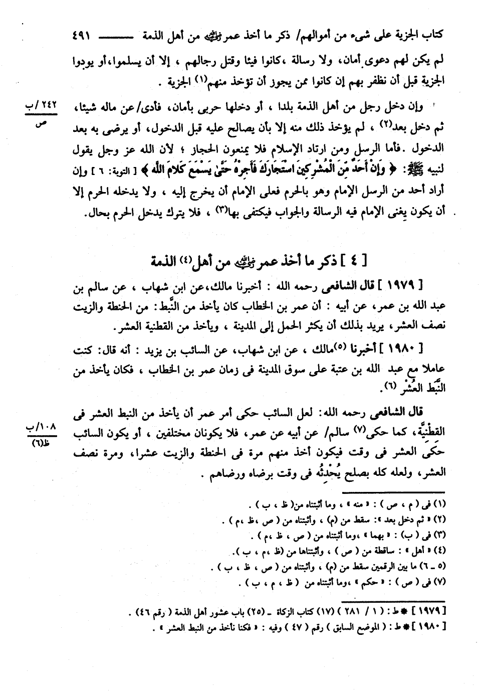 قَالَ الشَّافِعِيُّ : رحمه الله تعالى أَخْبَرَنَا مَالِكٌ عَنْ ابْنِ شِهَابٍ عَنْ سَالِمِ بْنِ عَبْدِ اللَّهِ بْنِ عُمَرَ عَنْ أَبِيهِ أَنَّ عُمَرَ بْنَ الْخَطَّابِ رضي الله تعالى عنه كَانَ يَأْخُذُ مِنْ النَّبَطِ مِنْ الْحِنْطَةِ وَالزَّيْتِ نِصْفَ الْعُشْرِ يُرِيدُ بِذَلِكَ أَنْ يُكْثِرَ الْحِمْلَ إلَى الْمَدِينَةِ وَيَأْخُذُ مِنْ الْقُطْنِيَّةِ الْعُشْرَ . أَخْبَرَنَا مَالِكٌ عَنْ ابْنِ شِهَابٍ عَنْ السَّائِبِ بْنِ يَزِيدَ أَنَّهُ قَالَ كُنْت عَامِلاً مَعَ عَبْدِ اللَّهِ بْنِ عُتْبَةَ عَلَى سُوقِ الْمَدِينَةِ فِي زَمَانِ عُمَرَ بْنِ الْخَطَّابِ فَكَانَ يَأْخُذُ مِنْ النَّبَطِ الْعُشْرَ .
