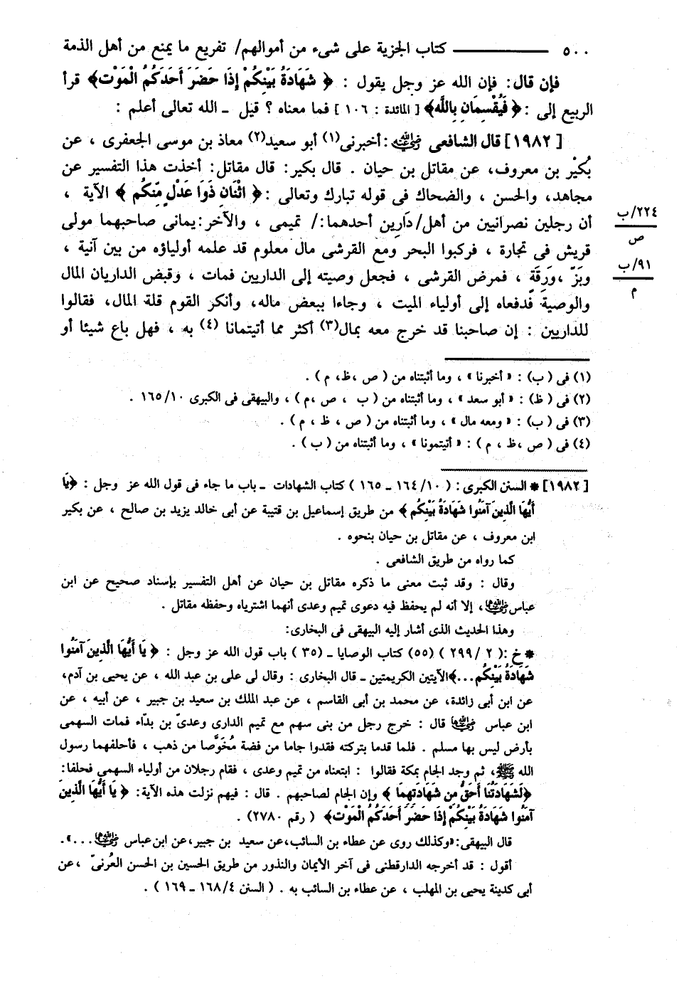 قَالَ الشَّافِعِيُّ : رحمه الله تعالى أَخْبَرَنَا أَبُو سَعِيدٍ مُعَاذُ بْنُ مُوسَى الْجَعْفَرِيُّ عَنْ بُكَيْرِ بْنِ مَعْرُوفٍ عَنْ مُقَاتِلِ بْنِ حِبَّانَ قَالَ بُكَيْر قَالَ مُقَاتِلٌ أَخَذْت هَذَا التَّفْسِيرَ عَنْ مُجَاهِدٍ وَالْحَسَنِ وَالضَّحَّاكِ فِي قَوْلِهِ تَبَارَكَ وَتَعَالَى { اثْنَانِ ذَوَا عَدْلٍ مِنْكُمْ ? الآيَةَ. { أَنَّ رَجُلَيْنِ نَصْرَانِيَّيْنِ مِنْ أَهْلِ دَارَيْنِ أَحَدُهُمَا تَمِيمِيٌّ وَالْآخَرُ يَمَانِيٌّ صَحِبَهُمَا مَوْلًى لِقُرَيْشٍ فِي تِجَارَةٍ فَرَكِبُوا الْبَحْرَ وَمَعَ الْقُرَشِيِّ مَالٌ مَعْلُومٌ قَدْ عَلِمَهُ أَوْلِيَاؤُهُ مِنْ بَيْنِ آنِيَةٍ وَبَزِّ وَرِقَةٍ فَمَرِضَ الْقُرَشِيُّ فَجَعَلَ وَصِيَّتَهُ إلَى الدَّارِيَيْنِ فَمَاتَ وَقَبَضَ الدَّارِيَانِ الْمَالَ وَالْوَصِيَّةَ فَدَفَعَاهُ إلَى أَوْلِيَاءِ الْمَيِّتِ وَجَاءَ بِبَعْضِ مَالِهِ وَأَنْكَرَ الْقَوْمُ قِلَّةَ الْمَالِ فَقَالُوا لِلدَّارِيَيْنِ إنَّ صَاحِبَنَا قَدْ خَرَجَ وَمَعَهُ مَالٌ أَكْثَرُ مِمَّا أَتَيْتُمَانَا بِهِ فَهَلْ بَاعَ شَيْئًا أَوْ@