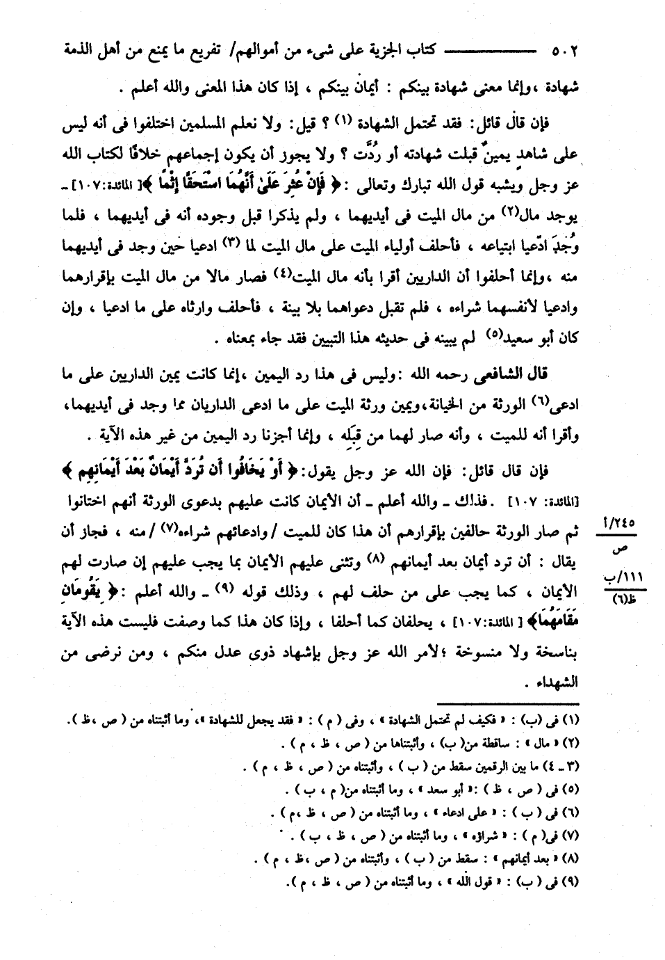 قَالَ الشَّافِعِيُّ: رحمه الله تعالى وَلَيْسَ فِي هَذَا رَدُّ الْيَمِينِ إنَّمَا كَانَتْ يَمِينُ الدَّارِيَيْنِ عَلَى ادِّعَاءِ الْوَرَثَةِ مِنْ الْخِيَانَةِ وَيَمِينُ وَرَثَةِ الْمَيِّتِ عَلَى مَا ادَّعَى الدَّارِيَانِ مِمَّا وُجِدَ فِي أَيْدِيهِمَا وَأَقَرَّا أَنَّهُ لِلْمَيِّتِ وَأَنَّهُ صَارَ لَهُمَا مِنْ قِبَلِهِ وَإِنَّمَا أَجَزْنَا رَدَّ الْيَمِينِ مِنْ غَيْرِ هَذِهِ الآيَةِ فَإِنْ قَالَ قَائِلٌ فَإِنَّ اللَّهَ عَزَّ وَجَلَّ يَقُولُ {أَوْ يَخَافُوا أَنْ تُرَدُّ أَيْمَانٌ بَعْدَ أَيْمَانِهِمْ} فَذَلِكَ وَاَللَّهُ تَعَالَى أَعْلَمُ أَنَّ الْأَيْمَانَ كَانَتْ عَلَيْهِمْ بِدَعْوَى الْوَرَثَةِ أَنَّهُمْ اخْتَانُوا ثُمَّ صَارَ الْوَرَثَةُ حَالِفِينَ بِإِقْرَارِهِمْ أَنَّ هَذَا كَانَ لِلْمَيِّتِ وَادِّعَائِهِمْ شِرَاءَهُ مِنْهُ فَجَازَ أَنْ يُقَالَ أَنْ تُرَدَّ أَيْمَانٌ تُثْنَى عَلَيْهِمْ الْأَيْمَانُ بِمَا يَجِبُ عَلَيْهِمْ إنْ صَارَتْ لَهُمْ الْأَيْمَانُ كَمَا يَجِبُ عَلَى مَنْ حَلَفَ لَهُمْ وَذَلِكَ قَوْلُ اللَّهِ , وَاَللَّهُ تَعَالَى أَعْلَمُ {يَقُومَانِ مَقَامَهُمَا} يَحْلِفَانِ كَمَا أَحَلَفَا وَإِذَا كَانَ هَذَا كَمَا وَصَفْت فَلَيْسَتْ هَذِهِ الْآيَةُ بِنَاسِخَةٍ وَلاَ مَنْسُوخَةٍ لِأَمْرِ اللَّهِ عَزَّ وَجَلَّ بِإِشْهَادِ ذَوَيْ عَدْلٍ مِنْكُمْ وَمَنْ نَرْضَى مِنْ الشُّهَدَاءِ.@
