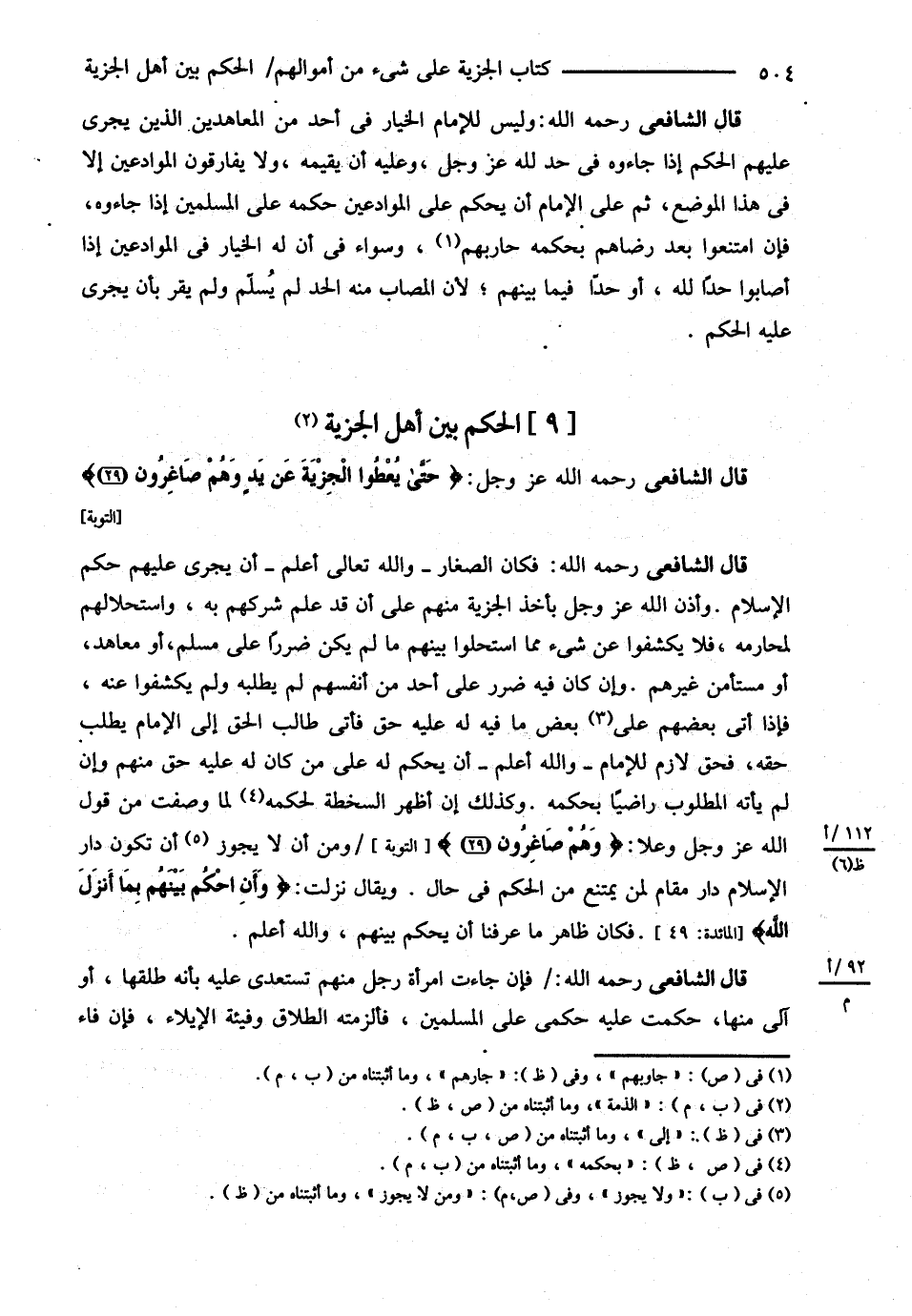 قَالَ الشَّافِعِيُّ : رحمه الله تعالى فَكَانَ الصَّغَارُ وَاَللَّهُ تَعَالَى أَعْلَمُ أَنْ يُجْرِيَ عَلَيْهِمْ حُكْمَ الْإِسْلاَمِ وَأَذِنَ اللَّهُ بِأَخْذِ الْجِزْيَةِ مِنْهُمْ عَلَى أَنْ قَدْ عَلِمَ شِرْكَهُمْ بِهِ وَاسْتِحْلاَلَهُمْ لِمَحَارِمِهِ فَلاَ يَكْشِفُوا عَنْ شَيْءٍ مِمَّا اسْتَحَلُّوا بَيْنَهُمْ مَا لَمْ يَكُنْ ضَرَرًا عَلَى مُسْلِمٍ أَوْ مُعَاهَدٍ أَوْ مُسْتَأْمَنِ غَيْرِهِمْ وَإِنْ كَانَ فِيهِ ضَرَرٌ عَلَى أَحَدٍ مِنْ أَنْفُسِهِمْ لَمْ يَطْلُبْهُ لَمْ يَكْشِفُوا عَنْهُ فَإِذَا أَبَى بَعْضُهُمْ عَلَى بَعْضٍ مَا فِيهِ لَهُ عَلَيْهِ حَقٌّ فَأَتَى طَالِبُ الْحَقِّ إلَى الْإِمَامِ يَطْلُبُ حَقَّهُ فَحَقٌّ لاَزِمٌ لِلْإِمَامِ وَاَللَّهُ تَعَالَى أَعْلَمُ أَنْ يَحْكُمَ لَهُ عَلَى مَنْ كَانَ لَهُ عَلَيْهِ حَقٌّ مِنْهُمْ وَإِنْ لَمْ يَأْتِهِ الْمَطْلُوبُ رَاضِيًا بِحُكْمِهِ وَكَذَلِكَ إنْ أَظْهَرَ السَّخْطَةَ لِحُكْمِهِ لِمَا وَصَفْت مِنْ قَوْلِ اللَّهِ عَزَّ وَجَلَّ : ? وَهُمْ صَاغِرُونَ } وَلاَ يَجُوزُ أَنْ تَكُونَ دَارُ الْإِسْلاَمِ دَارَ مُقَامٍ لِمَنْ يَمْتَنِعُ مِنْ الْحُكْمِ فِي حَالٍ وَيُقَالُ نَزَلَتْ { وَأَنْ اُحْكُمْ بَيْنَهُمْ بِمَا أَنْزَلَ اللَّهُ } فَكَانَ ظَاهِرُ مَا عَرَفْنَا أَنْ يَحْكُمَ بَيْنَهُمْ وَاَللَّهُ تَعَالَى أَعْلَمُ .