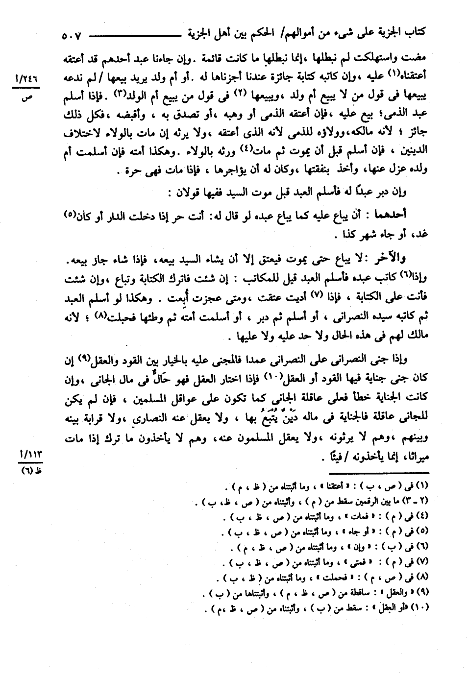 مَضَتْ وَاسْتُهْلِكَتْ لَمْ نُبْطِلْهَا إنَّمَا نُبْطِلُهَا مَا كَانَتْ قَائِمَةً وَإِنْ جَاءَنَا عَبْدُ أَحَدِهِمْ قَدْ أَعْتَقَهُ أَعْتَقْنَا عَلَيْهِ وَإِنْ كَاتَبَهُ كِتَابَةً جَائِزَةً عِنْدَمَا أَجَزْنَاهَا لَهُ أَوْ أُمُّ وَلَدٍ يُرِيدُ بَيْعَهَا لَمْ نَدَعْهُ يَبِيعُهَا فِي قَوْلِ مَنْ لاَ يَبِيعُ أُمَّ الْوَلَدِ وَيَبِيعُهَا فِي قَوْلِ مَنْ يَبِيعُ أُمَّ الْوَلَدِ فَإِذَا أَسْلَمَ عَبْدُ الذِّمِّيِّ بِيعَ عَلَيْهِ فَإِنْ أَعْتَقَهُ الذِّمِّيُّ أَوْ وَهَبَهُ أَوْ تَصَدَّقَ بِهِ وَأَقْبَضَهُ فَكُلُّ ذَلِكَ جَائِزٌ لِأَنَّهُ مَالِكُهُ وَوَلاَؤُهُ لِلذِّمِّيِّ لِأَنَّهُ الَّذِي أَعْتَقَهُ وَلاَ يَرِثُهُ إنْ مَاتَ بِالْوَلاَءِ لِاخْتِلاَفِ الدِّينَيْنِ , فَإِنْ أَسْلَمَ قَبْلَ أَنْ يَمُوتَ ثُمَّ مَاتَ وَرِثَهُ بِالْوَلاَءِ وَهَكَذَا أَمَتُهُ فَإِنْ أَسْلَمَتْ أُمُّ وَلَدِهِ عُزِلَ عَنْهَا وَأُخِذَ بِنَفَقَتِهَا وَكَانَ لَهُ أَنْ يُؤَاجِرَهَا فَإِذَا مَاتَ فَهِيَ حُرَّةٌ وَإِنْ دَبَّرَ عَبْدًا لَهُ فَأَسْلَمَ الْعَبْدُ قَبْلَ مَوْتِ السَّيِّدِ فَفِيهَا قَوْلاَنِ , أَحَدُهُمَا أَنْ يُبَاعَ عَلَيْهِ كَمَا يُبَاعُ عَبْدُهُ لَوْ قَالَ لَهُ أَنْتَ حُرٌّ إذَا دَخَلْت الدَّارَ أَوْ كَانَ غَدٌ أَوْ جَاءَ شَهْرُ كَذَا وَالْآخَرُ لاَ يُبَاعُ حَتَّى يَمُوتَ فَيَعْتِقَ إلَّا أَنْ يَشَاءَ السَّيِّدُ بَيْعَهُ فَإِذَا شَاءَ جَازَ بَيْعُهُ وَإِنْ كَاتَبَ عَبْدَهُ فَأَسْلَمَ الْعَبْدُ قِيلَ لِلْمُكَاتَبِ إنْ شِئْت فَاتْرُكْ الْكِتَابَةَ وَتُبَاعُ وَإِنْ شِئْت فَأَنْتَ عَلَى الْكِتَابَةِ فَإِذَا أَدَّيْت عَتَقْت وَمَتَى عَجَزْت أُبِعْتَ وَهَكَذَا لَوْ أَسْلَمَ الْعَبْدُ ثُمَّ كَاتَبَهُ سَيِّدُهُ النَّصْرَانِيُّ أَوْ أَسْلَمَ ثُمَّ دَبَّرَ أَوْ أَسْلَمَتْ أَمَتُهُ ثُمَّ وَطِئَهَا فَحَبِلَتْ لِأَنَّهُ مَالِكٌ لَهُمْ فِي هَذِهِ الْحَالِ وَلاَ حَدَّ عَلَيْهِ وَلاَ عَلَيْهَا , وَإِذَا جَنَى النَّصْرَانِيُّ عَلَى النَّصْرَانِيِّ عَمْدًا فَالْمَجْنِيُّ عَلَيْهِ بِالْخِيَارِ بَيْنَ الْقَوَدِ وَالْعَقْلِ إنْ كَانَ جَنَى جِنَايَةً فِيهَا الْقَوَدُ فَإِذَا اخْتَارَ الْعَقْلَ فَهُوَ حَالٌّ فِي مَالِ الْجَانِي , وَإِنْ كَانَتْ الْجِنَايَةُ خَطَأً فَعَلَى عَاقِلَةِ الْجَانِي كَمَا تَكُونُ عَلَى عَوَاقِلِ الْمُسْلِمِينَ , فَإِنْ لَمْ يَكُنْ لِلْجَانِي عَاقِلَةٌ فَالْجِنَايَةُ فِي مَالِهِ دَيْنٌ يُتْبَعُ بِهَا وَلاَ يَعْقِلُ عَنْهُ النَّصَارَى وَلاَ قَرَابَةَ بَيْنَهُ وَبَيْنَهُمْ وَهُمْ لاَ يَرِثُونَ وَلاَ يَعْقِلُ الْمُسْلِمُونَ عَنْهُ وَهُمْ لاَ يَأْخُذُونَ مَا تَرَكَ إذَا مَاتَ مِيرَاثًا إنَّمَا يَأْخُذُونَهُ فَيْئًا .@