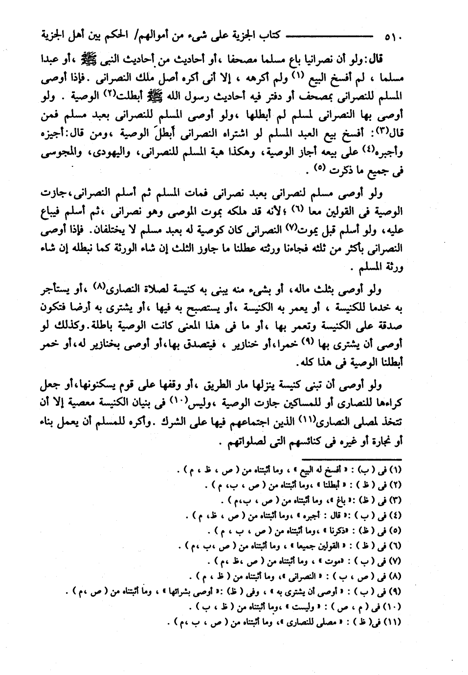 قَالَ : وَلَوْ أَنَّ نَصْرَانِيًّا بَاعَ مُسْلِمًا مُصْحَفًا أَوْ أَحَادِيثَ مِنْ أَحَادِيثِ النَّبِيِّ - صلى الله عليه وسلم - أَوْ عَبْدًا مُسْلِمًا لَمْ أَفْسَخْ لَهُ الْبَيْعَ وَلَمْ أَكْرَهْهُ إلَّا أَنِّي أَكْرَهُ أَصْلَ مِلْكِ النَّصْرَانِيِّ فَإِذَا أَوْصَى الْمُسْلِمُ لِلنَّصْرَانِيِّ بِمُصْحَفٍ أَوْ دَفْتَرٍ فِيهِ أَحَادِيثُ رَسُولِ اللَّهِ - صلى الله عليه وسلم - أَبْطَلْت الْوَصِيَّةَ . وَلَوْ أَوْصَى بِهَا النَّصْرَانِيُّ لِمُسْلِمٍ لَمْ أُبْطِلْهَا وَلَوْ أَوْصَى الْمُسْلِمُ لِلنَّصْرَانِيِّ بِعَبْدٍ مُسْلِمٍ فَمَنْ قَالَ أَفْسَخُ بَيْعَ الْعَبْدِ الْمُسْلِمِ لَوْ اشْتَرَاهُ النَّصْرَانِيُّ أَبْطَلَ الْوَصِيَّةَ وَمَنْ قَالَ أُجْبِرُهُ عَلَى بَيْعِهِ أَجَازَ الْوَصِيَّةَ , وَهَكَذَا هِبَةُ الْمُسْلِمِ لِلنَّصْرَانِيِّ وَالْيَهُودِيِّ وَالْمَجُوسِيِّ فِي جَمِيعِ مَا ذَكَرْت , وَلَوْ أَوْصَى مُسْلِمٌ لِنَصْرَانِيٍّ بِعَبْدٍ نَصْرَانِيٍّ فَمَاتَ الْمُسْلِمُ ثُمَّ أَسْلَمَ النَّصْرَانِيُّ جَازَتْ الْوَصِيَّةُ فِي الْقَوْلَيْنِ مَعًا لِأَنَّهُ قَدْ مَلَكَهُ بِمَوْتِ الْمُوصِي وَهُوَ نَصْرَانِيٌّ ثُمَّ أَسْلَمَ فَيُبَاعُ عَلَيْهِ , وَلَوْ أَسْلَمَ قَبْلَ مَوْتِهِ النَّصْرَانِيُّ كَانَ كَوَصِيَّةٍ لَهُ بِعَبْدٍ لاَ يَخْتَلِفَانِ , فَإِذَا أَوْصَى النَّصْرَانِيُّ بِأَكْثَرَ مِنْ ثُلُثِهِ فَجَاءَنَا وَرَثَتُهُ أَبْطَلْنَا مَا جَاوَزَ الثُّلُثَ إنْ شَاءَ الْوَرَثَةُ كَمَا نُبْطِلُهُ إنْ شَاءَ وَرَثَةُ الْمُسْلِمِ وَلَوْ أَوْصَى بِثُلُثِ مَالِهِ أَوْ بِشَيْءٍ مِنْهُ يَبْنِي بِهِ كَنِيسَةً لِصَلاَةِ النَّصَارَى أَوْ يَسْتَأْجِرُ بِهِ خَدَمًا لِلْكَنِيسَةِ أَوْ يَعْمُرُ بِهِ الْكَنِيسَةَ أَوْ يَسْتَصْبِحُ بِهِ فِيهَا أَوْ يَشْتَرِي بِهِ أَرْضًا فَتَكُونُ صَدَقَةً عَلَى الْكَنِيسَةِ وَتَعْمُرُ بِهَا أَوْ مَا فِي هَذَا الْمَعْنَى كَانَتْ الْوَصِيَّةُ بَاطِلَةً , وَكَذَلِكَ لَوْ أَوْصَى أَنْ يَشْتَرِيَ بِهِ خَمْرًا أَوْ خَنَازِيرَ فَيَتَصَدَّقَ بِهَا أَوْ أَوْصَى بِخَنَازِيرِ لَهُ أَوْ خَمْرٍ أَبْطَلْنَا الْوَصِيَّةَ فِي هَذَا كُلِّهِ , وَلَوْ أَوْصَى أَنْ تُبْنَى كَنِيسَةٌ يَنْزِلُهَا مَارُّ الطَّرِيقِ أَوْ وَقَفَهَا عَلَى قَوْمٍ يَسْكُنُونَهَا أَوْ جَعَلَ كِرَاءَهَا لِلنَّصَارَى أَوْ لِلْمَسَاكِينِ جَازَتْ الْوَصِيَّةُ وَلَيْسَ فِي بُنْيَانِ الْكَنِيسَةِ مَعْصِيَةٌ إلَّا أَنْ تُتَّخَذَ لِمُصَلَّى النَّصَارَى الَّذِينَ اجْتِمَاعُهُمْ فِيهَا عَلَى الشِّرْكِ وَأَكْرَهُ لِلْمُسْلِمِ أَنْ يَعْمَلَ بِنَاءً أَوْ نِجَارَةً أَوْ غَيْرَهُ فِي كَنَائِسِهِمْ الَّتِي لِصَلَوَاتِهِمْ ,@