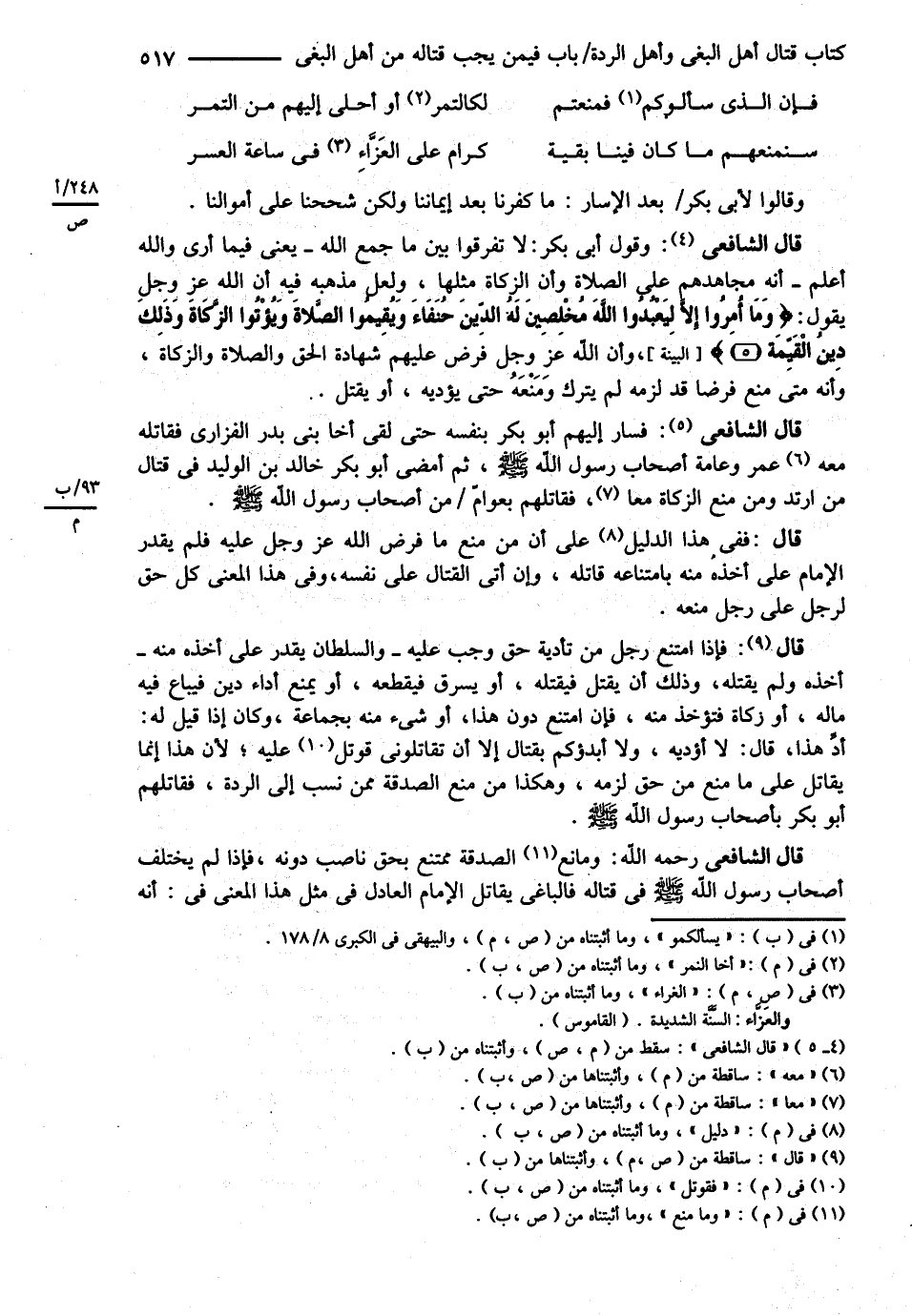 قَالَ الشَّافِعِيُّ : وَمَانِعُ الصَّدَقَةِ مُمْتَنِعٌ بِحَقٍّ نَاصِبٍ دُونَهُ فَإِذَا لَمْ يَخْتَلِفْ أَصْحَابُ رَسُولِ اللَّهِ - صلى الله عليه وسلم - فِي قِتَالِهِ فَالْبَاغِي يُقَاتِلُ الْإِمَامَ الْعَادِلَ فِي مِثْلِ هَذَا الْمَعْنَى فِي أَنَّهُ@
