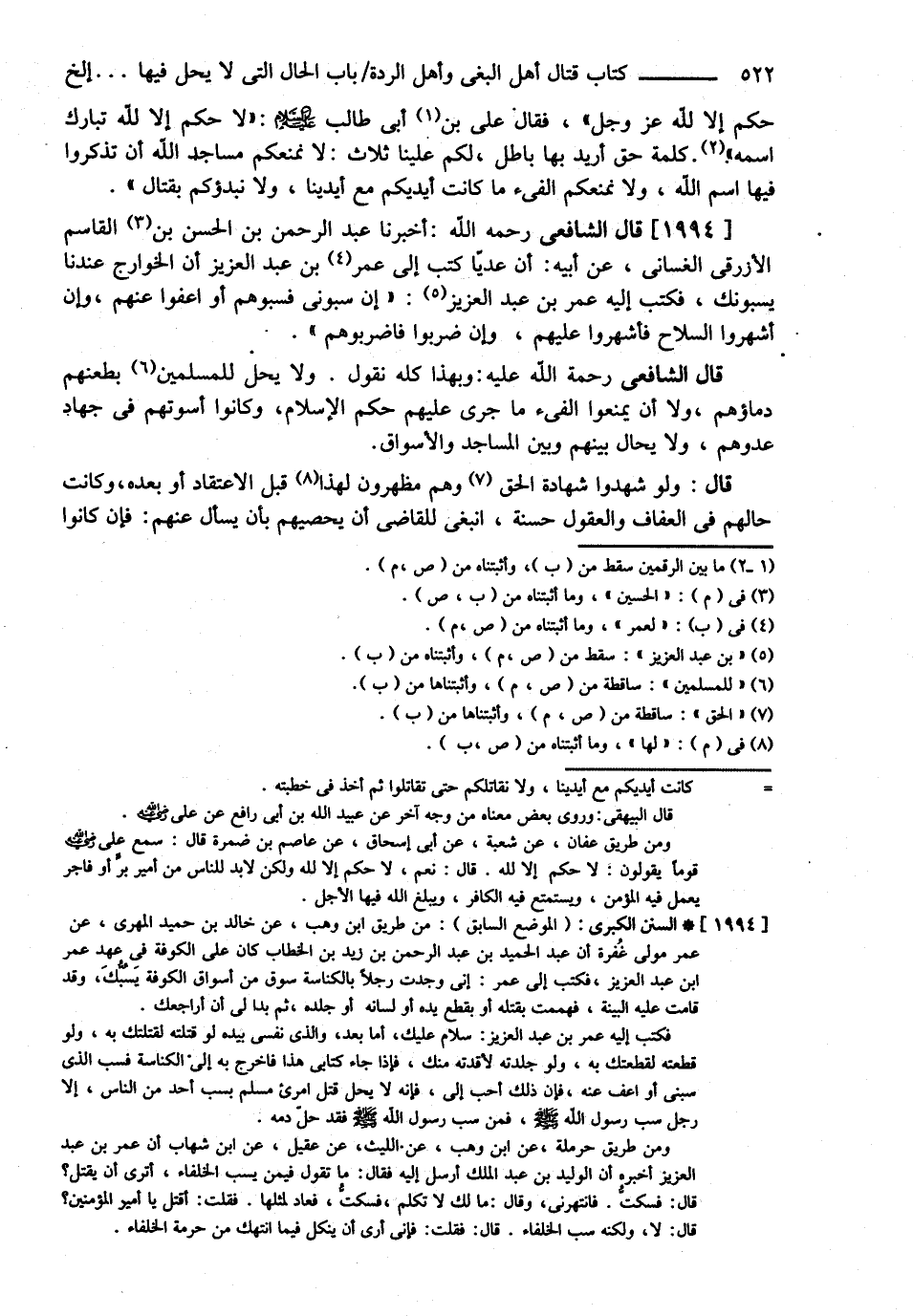 قَالَ الشَّافِعِيُّ : رحمه الله أَخْبَرَنَا عَبْدُ الرَّحْمَنِ بْنُ الْحَسَنِ بْنِ الْقَاسِمِ الْأَزْرَقِيُّ الْغَسَّانِيُّ عَنْ أَبِيهِ أَنَّ عَدِيًّا كَتَبَ لِعُمَرَ بْنِ عَبْدِ الْعَزِيزِ أَنَّ الْخَوَارِجَ عِنْدَنَا يَسُبُّونَك فَكَتَبَ إلَيْهِ عُمَرُ بْنُ عَبْدِ الْعَزِيزِ إنْ سَبُّونِي فَسُبُّوهُمْ أَوْ اُعْفُوَا عَنْهُمْ وَإِنْ أَشْهَرُوا السِّلاَحَ فَأَشْهِرُوا عَلَيْهِمْ وَإِنْ ضَرَبُوا فَاضْرِبُوهُمْ .