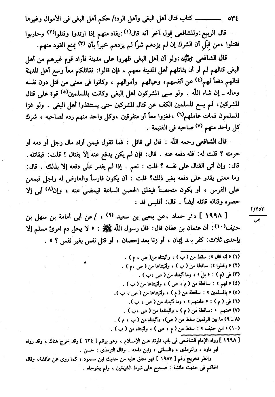قَالَ الشَّافِعِيُّ : رحمه الله تعالى : قَالَ لِي قَائِلٌ : فَمَا تَقُولُ فِيمَنْ أَرَادَ مَالَ رَجُلٍ أَوْ دَمَهُ أَوْ حُرْمَتَهُ ؟ قُلْتُ لَهُ : فَلَهُ دَفْعُهُ عَنْهُ , قَالَ فَإِنْ لَمْ يَكُنْ يُدْفَعُ عَنْهُ إلَّا بِقِتَالٍ ؟ قُلْت فَيُقَاتِلُهُ , قَالَ وَإِنْ أَتَى الْقِتَالُ عَلَى نَفْسِهِ ؟ قُلْت : نَعَمْ . إذَا لَمْ يَقْدِرْ عَلَى دَفْعِهِ إلَّا بِذَلِكَ . قَالَ : وَمَا مَعْنَى يَقْدِرُ عَلَى دَفْعِهِ بِغَيْرِ ذَلِكَ ؟ قُلْت : أَنْ يَكُونَ فَارِسًا وَالْعَارِضُ لَهُ رَاجِلٌ فَيُمْعِنَ عَلَى الْفَرَسِ , أَوْ يَكُونَ مُتَحَصِّنًا فَيُغْلِقَ الْحِصْنَ السَّاعَةَ فَيَمْضِيَ عَنْهُ . وَإِنْ أَبَى إلَّا حَصْرَهُ وَقِتَالَهُ قَاتَلَهُ أَيْضًا , قَالَ : أَفَلَيْسَ قَدْ ذَكَرَ حَمَّادٌ عَنْ يَحْيَى بْنِ سَعِيدٍ عَنْ أَبِي أُمَامَةَ بْنِ سَهْلِ بْنِ حُنَيْفٍ أَنَّ عُثْمَانَ بْنَ عَفَّانَ قَالَ : قَالَ رَسُولُ اللَّهِ - صلى الله عليه وسلم - { لاَ يَحِلُّ دَمُ امْرِئٍ مُسْلِمٍ إلَّا بِإِحْدَى ثَلاَثٍ : كُفْرٌ بَعْدَ إيمَانٍ , أَوْ زِنًا بَعْدَ إحْصَانٍ , أَوْ قَتْلُ نَفْسٍ بِغَيْرِ نَفْسٍ }@