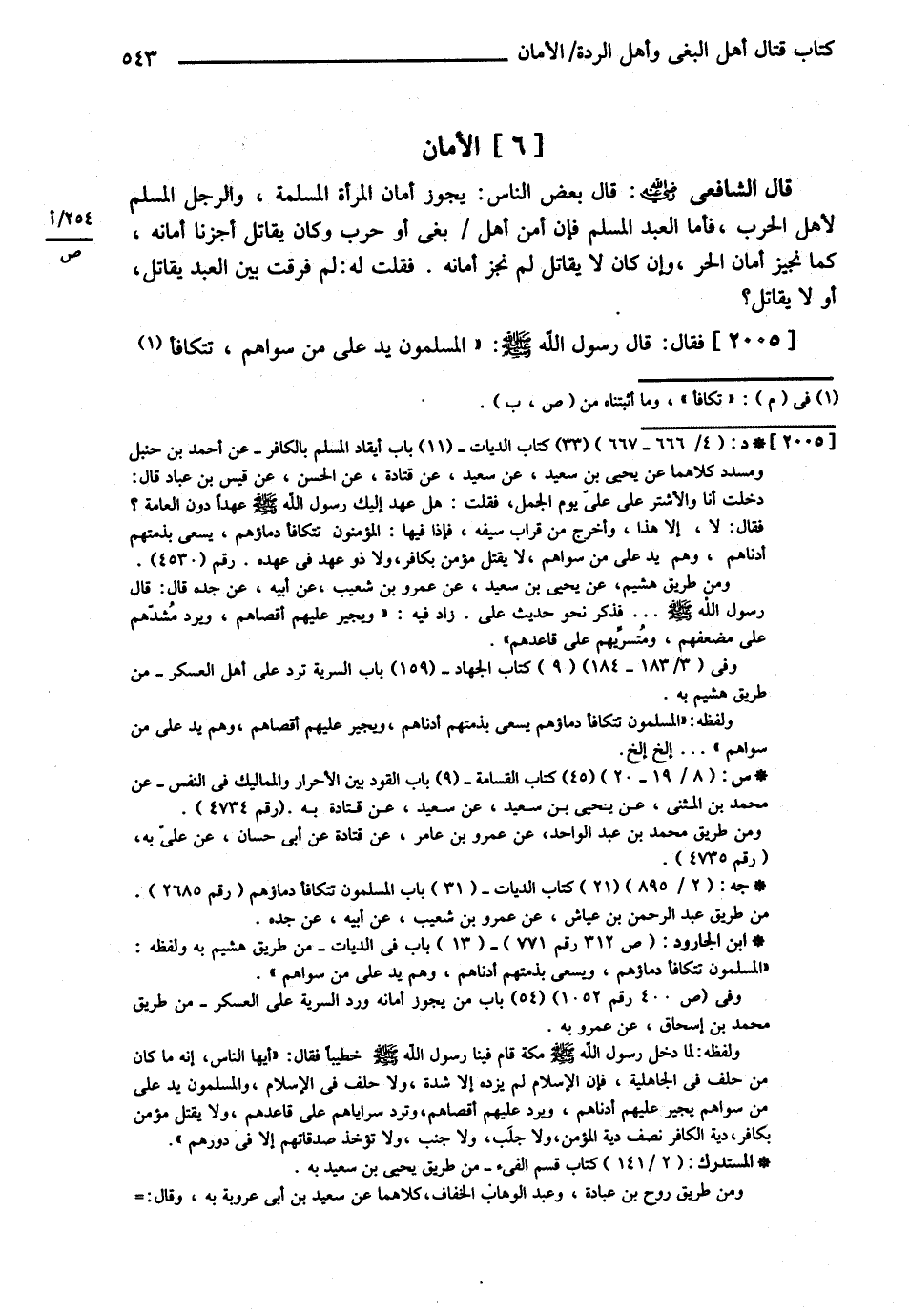قَالَ الشَّافِعِيُّ : رحمه الله تعالى : قَالَ بَعْضُ النَّاسِ يَجُوزُ أَمَانُ الْمَرْأَةِ الْمُسْلِمَةِ , وَالرَّجُلِ الْمُسْلِمِ لِأَهْلِ الْحَرْبِ فَأَمَّا الْعَبْدُ الْمُسْلِمُ فَإِنْ أَمَّنَ أَهْلَ بَغْيٍ أَوْ حَرْبٍ وَكَانَ يُقَاتِلُ أَجَزْنَا أَمَانَهُ كَمَا نُجِيزُ أَمَانَ الْحُرِّ وَإِنْ كَانَ لاَ يُقَاتِلُ لَمْ نُجِزْ أَمَانَهُ , فَقُلْت لَهُ لِمَ فَرَّقْت بَيْنَ الْعَبْدِ يُقَاتِلُ وَلاَ يُقَاتِلُ ؟ فَقَالَ : قَالَ رَسُولُ اللَّهِ - صلى الله عليه وسلم - { الْمُسْلِمُونَ يَدٌ عَلَى مَنْ سِوَاهُمْ تَتَكَافَأُ@