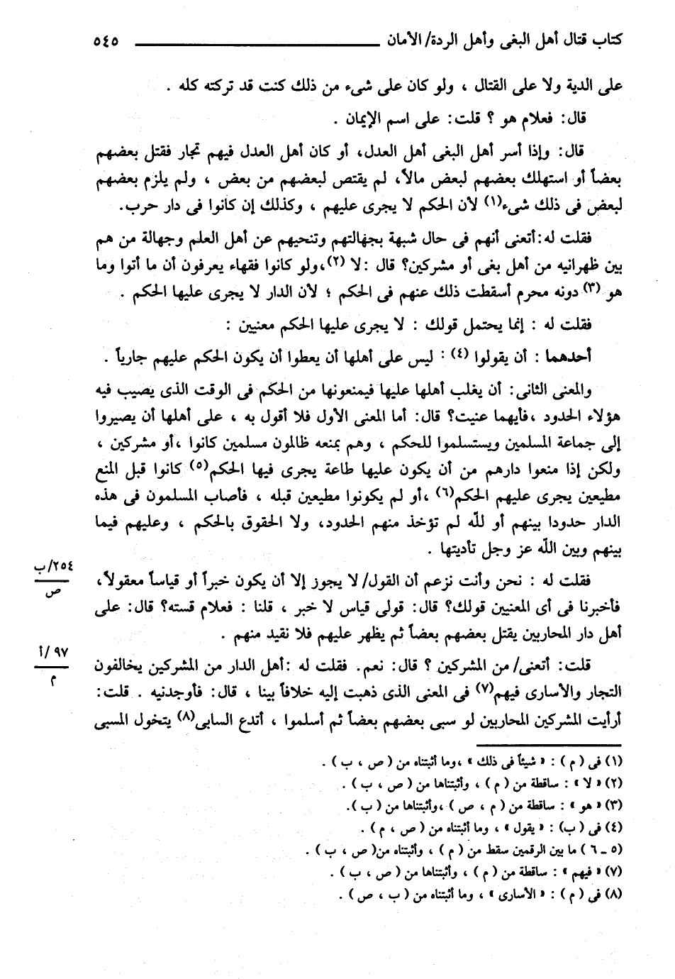 عَلَى الدِّيَةِ وَلاَ عَلَى الْقِتَالِ , وَلَوْ كَانَ عَلَى شَيْءٍ مِنْ ذَلِكَ كُنْت قَدْ تَرَكْته كُلَّهُ , قَالَ فَعَلاَمَ هُوَ ؟ قُلْت عَلَى اسْمِ الْإِيمَانِ قَالَ وَإِذَا أَسَرَ أَهْلُ الْبَغْيِ أَهْلَ الْعَدْلِ وَكَانَ أَهْلُ الْعَدْلِ فِيهِمْ تُجَّارٌ فَقَتَلَ بَعْضُهُمْ بَعْضًا أَوْ اسْتَهْلَكَ بَعْضُهُمْ لِبَعْضٍ مَالاً لَمْ يُقْتَصَّ لِبَعْضِهِمْ مِنْ بَعْضٍ وَلَمْ يَلْزَمْ بَعْضَهُمْ لِبَعْضٍ فِي ذَلِكَ شَيْءٌ لِأَنَّ الْحُكْمَ لاَ يَجْرِي عَلَيْهِمْ , وَكَذَلِكَ إنْ كَانُوا فِي دَارِ حَرْبٍ , فَقُلْت لَهُ أَتَعْنِي أَنَّهُمْ فِي حَالِ شُبْهَةٍ بِجُهَّالِهِمْ وَتَنَحِّيهِمْ عَنْ أَهْلِ الْعِلْمِ وَجَهَالَةِ مَنْ هُمْ بَيْنَ ظَهْرَانَيْهِ مِمَّنْ أَهْلُ بَغْيٍ أَوْ مُشْرِكِينَ ؟ قَالَ لاَ وَلَوْ كَانُوا فُقَهَاءَ يَعْرِفُونَ أَنَّ مَا أَتَوْا وَمَا هُوَ دُونَهُ مُحَرَّمٌ أَسْقَطْت ذَلِكَ عَنْهُمْ فِي الْحُكْمِ لِأَنَّ الدَّارَ لاَ يَجْرِي عَلَيْهَا الْحُكْمُ فَقُلْت لَهُ إنَّمَا يَحْتَمِلُ قَوْلُك لاَ يَجْرِي عَلَيْهَا الْحُكْم مَعْنَيَيْنِ , أَحَدُهُمَا أَنْ تَقُولَ لَيْسَ عَلَى أَهْلِهَا أَنْ يُعْطُوا أَنْ يَكُونَ الْحُكْمُ عَلَيْهِمْ جَارِيًا , وَالْمَعْنَى الثَّانِي أَنْ يَغْلِبَ أَهْلُهَا عَلَيْهَا فَيَمْنَعُوهَا مِنْ الْحُكْمِ فِي الْوَقْتِ الَّذِي يُصِيبُ فِيهِ هَؤُلاَءِ الْحُدُودِ فَأَيَّهُمَا عَنَيْت ؟ قَالَ أَمَّا الْمَعْنَى الْأَوَّلُ فَلاَ أَقُولُ بِهِ عَلَى أَهْلِهَا أَنْ يَصِيرُوا إلَى جَمَاعَةِ الْمُسْلِمِينَ وَيَسْتَسْلِمُوا لِلْحُكْمِ وَهُمْ بِمَنْعِهِ ظَالِمُونَ مُسْلِمُونَ كَانُوا أَوْ مُشْرِكِينَ وَلَكِنْ إذَا مَنَعُوا دَارَهُمْ مِنْ أَنْ يَكُونَ عَلَيْهَا طَاعَةٌ يَجْرِي فِيهَا الْحُكْمُ كَانُوا قَبْلَ الْمَنْعِ مُطِيعِينَ يَجْرِي عَلَيْهِمْ الْحُكْمُ أَوْ لَمْ يَكُونُوا مُطِيعِينَ قَبْلَهُ فَأَصَابَ الْمُسْلِمُونَ فِي هَذِهِ الدَّارِ حُدُودًا بَيْنَهُمْ أَوْ لِلَّهِ لَمْ تُؤْخَذْ مِنْهُمْ الْحُدُودُ وَلاَ الْحُقُوقُ بِالْحُكْمِ وَعَلَيْهِمْ فِيمَا بَيْنَهُمْ وَبَيْنَ اللَّهِ عَزَّ وَجَلَّ تَأْدِيَتُهَا فَقُلْت لَهُ نَحْنُ وَأَنْتَ تُزْعَمُ أَنَّ الْقَوْلَ لاَ يَجُوزُ إلَّا أَنْ يَكُونَ خَبَرًا أَوْ قِيَاسًا مَعْقُولاً فَأَخْبِرْنَا فِي أَيِّ الْمَعْنَيَيْنِ قَوْلُك ؟ قَالَ قَوْلِي قِيَاسٌ لاَ خَبَرٌ قُلْنَا فَعَلاَمَ قِسْتَهُ ؟ قَالَ عَلَى أَهْلِ دَارِ الْمُحَارَبِينَ يَقْتُلُ بَعْضُهُمْ بَعْضًا ثُمَّ يَظْهَرُ عَلَيْهِمْ فَلاَ نُقِيدُ مِنْهُمْ , قُلْت أَتَعْنِي مِنْ الْمُشْرِكِينَ ؟ قَالَ : نَعَمْ . فَقُلْت لَهُ أَهْلُ الدَّارِ مِنْ الْمُشْرِكِينَ يُخَالِفُونَ التُّجَّارَ وَالْأُسَارَى فِيهِمْ فِي الْمَعْنَى الَّذِي ذَهَبْت إلَيْهِ خِلاَفًا بَيِّنًا . قَالَ فَأَوْجَدَنِيهِ قُلْت أَرَأَيْت الْمُشْرِكِينَ الْمُحَارَبِينَ لَوْ سَبَى بَعْضُهُمْ بَعْضًا ثُمَّ أَسْلَمُوا أَتَدَعُ السَّابِيَ يَتَخَوَّلُ الْمَسْبِيَّ @
