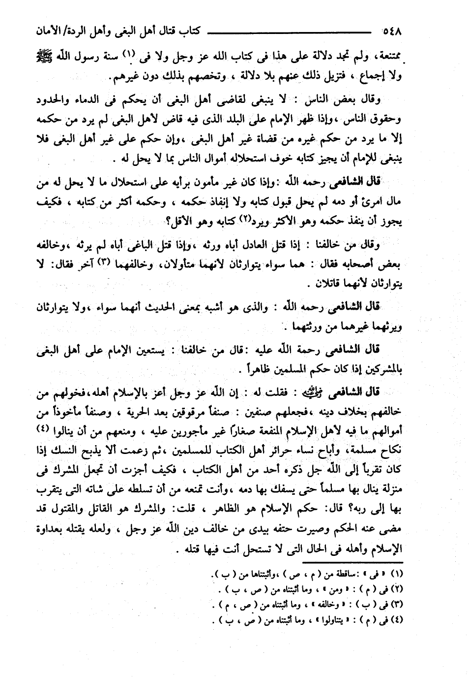 قَالَ الشَّافِعِيُّ: رحمه الله تعالى: وَإِذَا كَانَ غَيْرَ مَأْمُونٍ بِرَأْيِهِ عَلَى اسْتِحْلاَلِ مَا لاَ يَحِلُّ لَهُ مِنْ مَالِ امْرِئٍ أَوْ دَمِهِ لَمْ يَحِلَّ قَبُولُ كِتَابِهِ وَلاَ إنْفَاذُ حُكْمِهِ , وَحُكْمُهُ أَكْثَرُ مِنْ كِتَابِهِ فَكَيْفَ يَجُوزُ أَنْ يُنَفَّذَ حُكْمُهُ وَهُوَ الْأَكْثَرُ وَيُرَدَّ كِتَابُهُ وَهُوَ الْأَقَلُّ؟ وَقَالَ مَنْ خَالَفَنَا إذَا قَتَلَ الْعَادِلُ أَبَاهُ وَرِثَهُ وَإِذَا قَتَلَ الْبَاغِي لَمْ يَرِثْهُ وَخَالَفَهُ بَعْضُ أَصْحَابِهِ فَقَالَ هُمَا سَوَاءٌ يَتَوَارَثَانِ لِأَنَّهُمَا مُتَأَوِّلاَنِ وَخَالَفَهُ آخَرُ فَقَالَ لاَ يَتَوَارَثَانِ لِأَنَّهُمَا قَاتِلاَنِ.