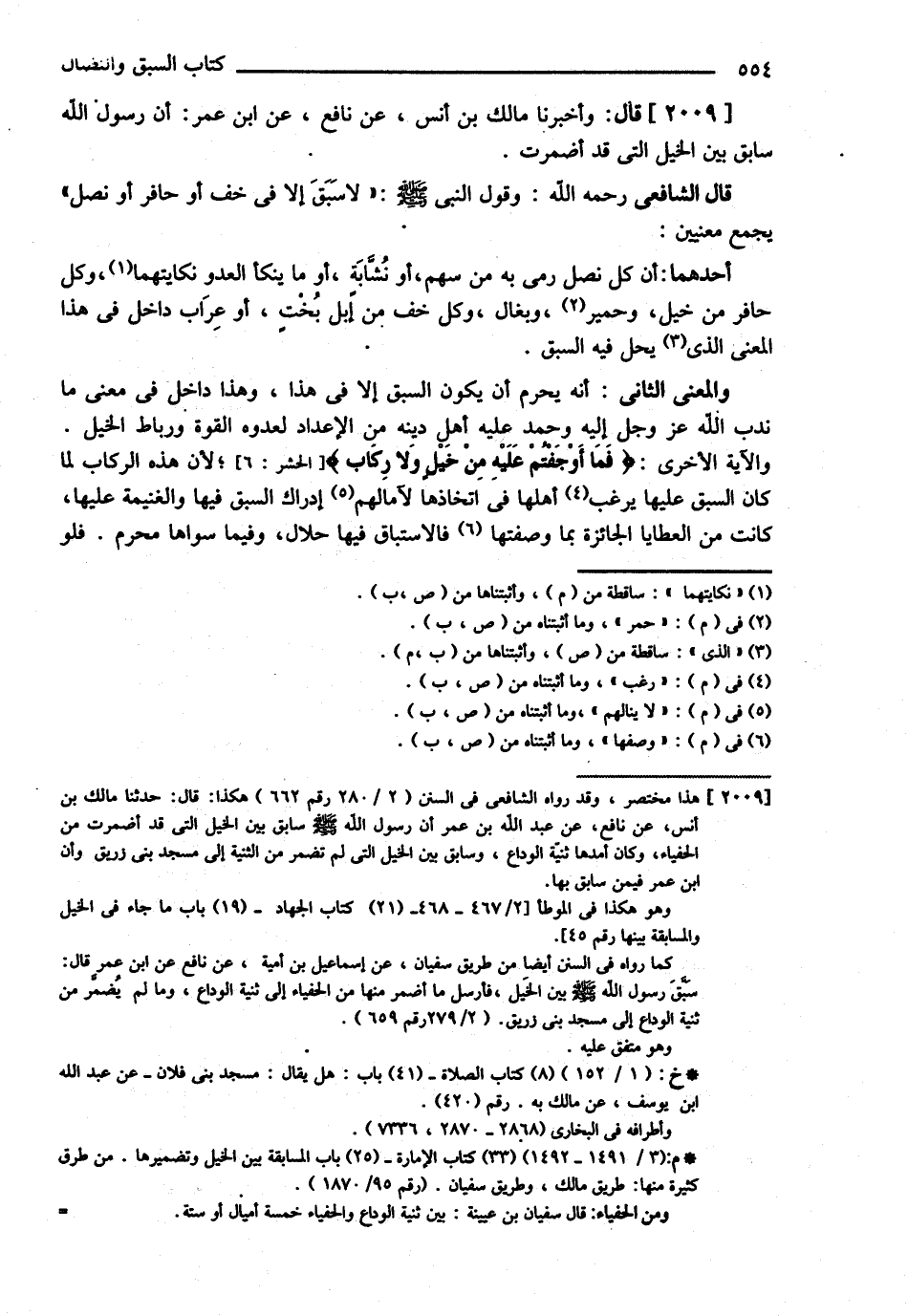 قَالَ الشَّافِعِيُّ : رحمه الله تعالى : وَقَوْلُ النَّبِيِّ - صلى الله عليه وسلم - { لاَ سَبَقَ إلَّا فِي خُفٍّ أَوْ حَافِرٍ أَوْ نَصْلٍ } يَجْمَعُ مَعْنَيَيْنِ أَحَدِهِمَا أَنَّ كُلَّ نَصْلٍ رُمِيَ بِهِ مِنْ سَهْمٍ أَوْ نُشَّابَةٍ أَوْ مَا يَنْكَأُ الْعَدُوُّ نِكَايَتَهُمَا وَكُلَّ حَافِرٍ مِنْ خَيْلٍ وَحَمِيرٍ وَبِغَالٍ وَكُلَّ خُفٍّ مِنْ إبِلٍ بُخْتٍ أَوْ عِرَابٍ دَاخِلٌ فِي هَذَا الْمَعْنَى الَّذِي يَحِلُّ فِيهِ السَّبَقُ . وَالْمَعْنَى الثَّانِي أَنَّهُ يَحْرُمُ أَنْ يَكُونَ السَّبَقُ إلَّا فِي هَذَا : وَهَذَا دَاخِلٌ فِي مَعْنَى مَا نَدَبَ اللَّهُ عَزَّ وَجَلَّ إلَيْهِ وَحَمِدَ عَلَيْهِ أَهْلَ دِينِهِ مِنْ الْإِعْدَادِ لِعَدُوِّهِ الْقُوَّةَ وَرِبَاطَ الْخَيْلِ وَالْآيَةُ الْأُخْرَى { فَمَا أَوَجَفْتُمْ عَلَيْهِ مِنْ خَيْلٍ وَلاَ رِكَابٍ } لِأَنَّ هَذِهِ الرِّكَابَ لَمَّا كَانَ السَّبَقُ عَلَيْهَا يُرَغِّبُ أَهْلَهَا فِي اتِّخَاذِهَا لِآمَالِهِمْ إدْرَاكَ السَّبَقِ فِيهَا وَالْغَنِيمَةِ عَلَيْهَا كَانَتْ مِنْ الْعَطَايَا الْجَائِزَةِ بِمَا وَصَفْتهَا فَالِاسْتِبَاقُ فِيهَا حَلاَلٌ وَفِيمَا سِوَاهَا مُحَرَّمٌ فَلَوْ@