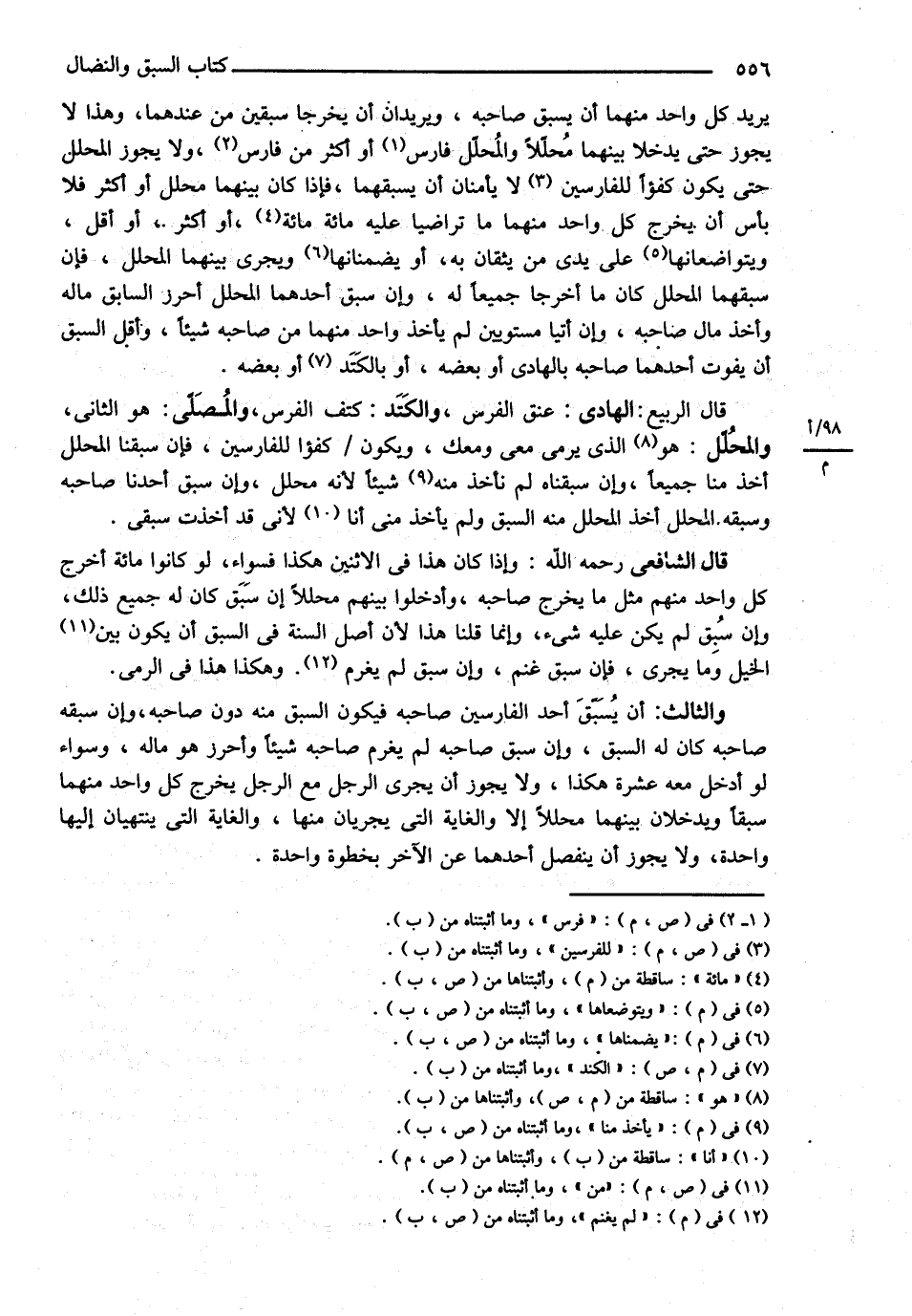 يُرِيدُ كُلُّ وَاحِدٍ مِنْهُمَا أَنْ يَسْبِقَ صَاحِبَهُ وَيُرِيدَانِ أَنْ يُخْرِجَا سَبَقَيْنِ مِنْ عِنْدِهِمَا وَهَذَا لاَ يَجُوزُ حَتَّى يُدْخِلاَ بَيْنَهُمَا مُحَلِّلاً , وَالْمُحَلِّلُ فَارِسٌ أَوْ أَكْثَرُ مِنْ فَارِسٍ وَلاَ يَجُوزُ الْمُحَلِّلُ حَتَّى يَكُونَ كُفُؤًا لِلْفَارِسَيْنِ لاَ يَأْمَنَانِ أَنْ يَسْبِقَهُمَا فَإِذَا كَانَ بَيْنَهُمَا مُحَلِّلٌ أَوْ أَكْثَرُ فَلاَ بَأْسَ أَنْ يُخْرِجَ كُلُّ وَاحِدٍ مِنْهُمَا مَا تَرَاضَيَا عَلَيْهِ مِائَةً مِائَةً أَوْ أَكْثَرَ أَوْ أَقَلَّ وَيَتَوَاضَعَانِهَا عَلَى يَدَيْ مَنْ يَثِقَانِ بِهِ أَوْ يَضْمَنَانِهَا وَيَجْرِي بَيْنَهُمَا الْمُحَلِّلُ فَإِنْ سَبَقَهُمَا الْمُحَلِّلُ كَانَ مَا أَخْرَجَا جَمِيعًا لَهُ وَإِنْ سَبَقَ أَحَدُهُمَا الْمُحَلِّلَ أَحْرَزَ السَّابِقُ مَالَهُ وَأَخَذَ مَالَ صَاحِبِهِ وَإِنْ أَتَيَا مُسْتَوِيَيْنِ لَمْ يَأْخُذْ وَاحِدٌ مِنْهُمَا مِنْ صَاحِبِهِ شَيْئًا وَأَقَلُّ السَّبَقِ أَنْ يَفُوتَ أَحَدُهُمَا صَاحِبَهُ بِالْهَادِي أَوْ بَعْضِهِ أَوْ بِالْكَتَدِ أَوْ بَعْضِهِ . ( قَالَ الرَّبِيعُ ) الْهَادِي عُنُقُ الْفَرَسِ وَالْكَتَدُ كَتِفُ الْفَرَسِ وَالْمُصَلِّي هُوَ الثَّانِي وَالْمُحَلِّلُ هُوَ الَّذِي يَرْمِي مَعِي وَمَعَك وَيَكُونُ كُفُؤًا لِلْفَارِسَيْنِ فَإِنْ سَبَقَنَا الْمُحَلِّلُ أَخَذَ مِنَّا جَمِيعًا وَإِنْ سَبَقْنَاهُ لَمْ نَأْخُذْ مِنْهُ شَيْئًا لِأَنَّهُ مُحَلِّلٌ وَإِنْ سَبَقَ أَحَدُنَا صَاحِبَهُ وَسَبَقَهُ الْمُحَلِّلُ أَخَذَ الْمُحَلِّلُ مِنْهُ السَّبَقَ وَلَمْ يَأْخُذْ مِنِّي لِأَنِّي قَدْ أَخَذْت سَبَقِي .