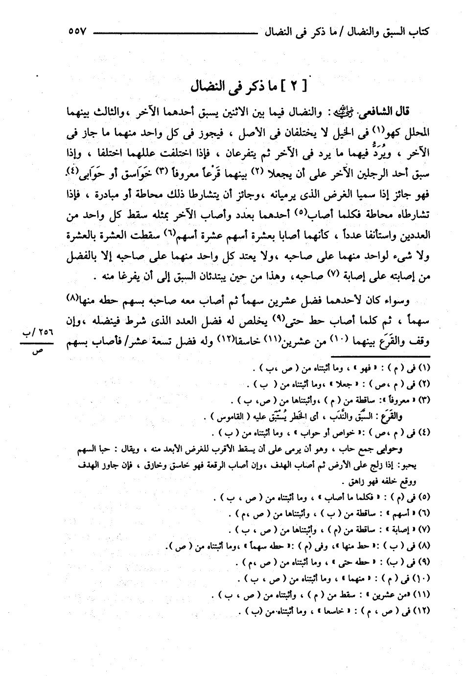 قَالَ الشَّافِعِيُّ : رحمه الله : وَالنِّضَالُ فِيمَا بَيْنَ الِاثْنَيْنِ يَسْبِقُ أَحَدُهُمَا الْآخَرَ وَالثَّالِثُ بَيْنَهُمَا الْمُحَلِّلُ كَهُوَ فِي الْخَيْلِ لاَ يَخْتَلِفَانِ فِي الْأَصْلِ فَيَجُوزُ فِي كُلِّ وَاحِدٍ مِنْهُمَا مَا جَازَ فِي الْآخَرِ وَيَرِدُ فِيهِمَا مَا يَرِدُ فِي الْآخَرِ ثُمَّ يَتَفَرَّعَانِ فَإِذَا اخْتَلَفَتْ عِلَلُهُمَا اخْتَلَفَا , وَإِذَا سَبَقَ أَحَدُ الرَّجُلَيْنِ الْآخَرَ عَلَى أَنْ يَجْعَلاَ بَيْنَهُمَا قَرَعًا مَعْرُوفًا خَوَاسِقَ أَوْ حَوَابِي فَهُوَ جَائِزٌ إذَا سَمَّيَا الْغَرَضَ الَّذِي يَرْمِيَانِهِ , وَجَائِزٌ أَنْ يَتَشَارَطَا ذَلِكَ مُحَاطَّةٌ أَوْ مُبَادَرَةً فَإِذَا تَشَارَطَاهُ مُحَاطَّةٌ فَكُلَّمَا أَصَابَ أَحَدُهُمَا بِعَدَدٍ وَأَصَابَ الْآخَرُ بِمِثْلِهِ سَقَطَ كُلُّ وَاحِدٍ مِنْ الْعَدَدَيْنِ وَاسْتَأْنَفَا عَدَدًا كَأَنَّهُمَا أَصَابَا بِعَشَرَةِ أَسْهُمٍ عَشَرَةً سَقَطَتْ الْعَشَرَةُ بِالْعَشَرَةِ وَلاَ شَيْءَ لِوَاحِدٍ مِنْهُمَا عَلَى صَاحِبِهِ وَلاَ يَعْتَدُّ كُلُّ وَاحِدٍ مِنْهُمَا عَلَى صَاحِبِهِ إلَّا بِالْفَضْلِ مِنْ إصَابَتِهِ عَلَى إصَابَةِ صَاحِبِهِ وَهَذَا مِنْ حِينِ يَبْتَدِئَانِ السَّبْقَ إلَى أَنْ يَفْرُغَا مِنْهُ وَسَوَاءٌ كَانَ لِأَحَدِهِمَا فَضْلُ عِشْرِينَ سَهْمًا ثُمَّ أَصَابَ مَعَهُ صَاحِبُهُ بِسَهْمٍ حُطَّ مِنْهُمَا سَهْمٌ ثُمَّ كُلَّمَا أَصَابَ حَطَّهُ حَتَّى يَخْلُصَ لَهُ فَضْلُ الْعَدَدِ الَّذِي شَرَطَ فَيَنْضُلَهُ