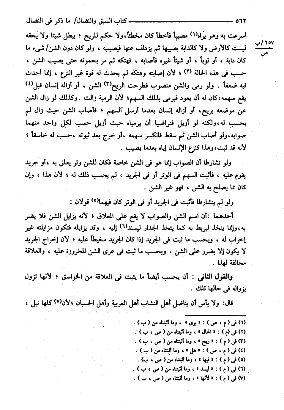 وَلَوْ تَشَارَطَا أَنَّ الصَّوَابَ إنَّمَا هُوَ فِي الشَّنِّ خَاصَّةً فَكَانَ لِلشَّنِّ وَتَرٌ يُعَلَّقُ بِهِ أَوْ جَرِيدٌ يَقُومُ عَلَيْهِ فَأَثْبَتَ السَّهْمَ فِي الْوَتَرِ أَوْ فِي الْجَرِيدِ لَمْ يُحْسَبْ ذَلِكَ لَهُ لِأَنَّ هَذَا وَإِنْ كَانَ مِمَّا يَصْلُحُ بِهِ الشَّنُّ فَهُوَ غَيْرُ الشَّنِّ , وَلَوْ لَمْ يَتَشَارَطَا فَأَثْبَتَ فِي الْجَرِيدِ أَوْ فِي الْوَتَرِ كَانَ فِيهِمَا قُولاَنِ , أَحَدُهُمَا أَنَّ اسْمَ الشَّنِّ وَالصَّوَابُ لاَ يَقَع عَلَى الْمِعْلاَقِ لِأَنَّهُ يُزَايِلُ الشَّنَّ فَلاَ يَضُرُّ بِهِ وَإِنَّمَا يُتَّخَذُ لِيُرْبَطَ بِهِ كَمَا يُتَّخَذُ الْجِدَارُ لِيُسْنَدَ إلَيْهِ وَقَدْ يُزَايِلُهُ فَتَكُونُ مُزَايَلَتُهُ غَيْرَ إخْرَابٍ لَهُ وَيُحْسَبُ مَا ثَبَتَ فِي الْجَرِيدِ إذَا كَانَ الْجَرِيدُ مَخِيطًا عَلَيْهِ لِأَنَّ إخْرَاجَ الْجَرِيدِ لاَ يَكُونُ إلَّا بِضَرَرٍ عَلَى الشَّنِّ , وَيُحْسَبُ مَا ثُبِّتَ فِي عُرَى الشَّنِّ الْمَخْرُوزَةِ عَلَيْهِ وَالْعَلَّاقَةُ مُخَالِفَةٌ لِهَذَا , وَالْقَوْلُ الثَّانِي أَنْ يُحْسَبَ أَيْضًا مَا يُثَبَّتُ فِي الْعَلَّاقَةِ مِنْ الخواسق لِأَنَّهَا تَزُولُ بِزَوَالِهِ فِي حَالِهَا تِلْكَ قَالَ وَلاَ بَأْسَ أَنْ يُنَاضِلَ أَهْلُ النُّشَّابِ أَهْلَ الْعَرَبِيَّةِ وَأَهْلَ الْحُسْبَانِ لِأَنَّ كُلَّهَا نَبْلٌ@