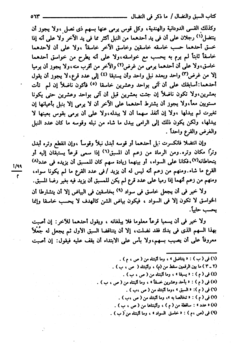 وَكَذَلِكَ الْقِسِيُّ الدُّودانِيَّةُ وَالْهِنْدِيَّةُ وَكُلُّ قَوْسٍ يُرْمَى عَنْهَا بِسَهْمٍ ذِي نَصْلٍ , وَلاَ يَجُوزُ أَنْ يَتَنَاضَلَ رَجُلاَنِ عَلَى أَنَّ فِي يَدِ أَحَدِهِمَا مِنْ النَّبْلِ أَكْثَرَ مِمَّا فِي يَدِ الْآخَرِ وَلاَ عَلَى أَنَّهُ إذَا خَسَقَ أَحَدُهُمَا حُسِبَ خَاسِقُهُ خَاسِقَيْنِ وَخَاسِقُ الْآخَرِ وَلاَ عَلَى أَنَّ لِأَحَدِهِمَا خَاسِقًا ثَابِتًا لَمْ يَرْمِ بِهِ يُحْسَبُ مَعَ خواسقه وَلاَ عَلَى أَنَّهُ يُطْرَحُ مِنْ خَوَاسِقُ أَحَدِهِمَا خَاسِقٌ وَلاَ عَلَى أَنَّ أَحَدَهُمَا يَرْمِي مِنْ عَرْضٍ وَالْآخَرَ مِنْ أَقْرَبَ مِنْهُ وَلاَ يَجُوزُ أَنْ يَرْمِيَا إلَّا مِنْ عَرْضٍ وَاحِدٍ وَبِعَدَدِ نَبْلٍ وَاحِدٍ وَأَنْ يَسْتَبِقَا إلَى عَدَدِ قُرَعٍ لاَ يَجُوزُ أَنْ يَقُولَ أَحَدُهُمَا أُسَابِقُك عَلَى أَنْ آتِيَ بِوَاحِدٍ وَعِشْرِينَ خَاسِقًا فَأَكُونُ نَاضِلاً إنْ لَمْ تَأْتِ بِعِشْرِينَ وَلاَ تَكُونُ نَاضِلاً إنْ جِئْت بِعِشْرِينَ قَبْلَ أَنْ آتِيَ بِوَاحِدٍ وَعِشْرِينَ حَتَّى يَكُونَا مُسْتَوِيَيْنِ مَعًا وَلاَ يَجُوزُ أَنْ يَشْتَرِطَ أَحَدُهُمَا عَلَى الْآخَرِ أَنْ لاَ يَرْمِيَ إلَّا بِنَبْلٍ بِأَعْيَانِهَا إنْ تَغَيَّرَتْ لَمْ يُبَدِّلْهَا وَلاَ إنْ أَنْفَذَ سَهْمًا أَنْ لاَ يُبَدِّلَهُ وَلاَ عَلَى أَنْ يَرْمِيَ بِقَوْسٍ بِعَيْنِهَا لاَ يُبَدِّلُهَا وَلَكِنْ يَكُونُ ذَلِكَ إلَى الرَّامِي يُبَدِّلُ مَا شَاءَ مِنْ نَبْلِهِ وَقَوْسِهِ مَا كَانَ عَدَدُ النَّبْلِ وَالْغَرَضِ وَالْقَرَعِ وَاحِدًا , وَإِنْ انْتَضَلاَ فَانْكَسَرَتْ نَبْلُ أَحَدِهِمَا أَوْ قَوْسُهُ أُبْدِلَ نَبْلاً وَقَوْسًا , وَإِنْ انْقَطَعَ وَتَرُهُ أُبْدِلَ وَتَرًا مَكَانَ وَتَرِهِ , وَمِنْ الرُّمَاةِ مَنْ زَعَمَ أَنَّ الْمُسْبَقَ إذَا سَمَّى قُرَعًا يَسْتَبِقَانِ إلَيْهِ أَوْ يتحاطانه فَكَانَا عَلَى السَّوَاءِ أَوْ بَيْنَهُمَا زِيَادَةُ سَهْمٍ كَانَ لِلْمُسْبَقِ أَنْ يَزِيدَ فِي عَدَدِ الْقُرَعِ مَا شَاءَ , وَمِنْهُمْ مَنْ زَعَمَ أَنَّهُ لَيْسَ لَهُ أَنْ يَزِيدَ فِي عَدَدِ الْقُرَعِ مَا لَمْ يَكُونَا سَوَاءً وَمِنْهُمْ مَنْ زَعَمَ أَنَّهُمَا إذَا رَمَيَا عَلَى عَدَدِ قُرَعٍ لَمْ يَكُنْ لِلْمُسْبَقِ أَنْ يَزِيدَ فِيهِ بِغَيْرِ رِضَا الْمُسْبَقِ وَلاَ خَيْرَ فِي أَنْ يُجْعَلَ خَاسِقٌ فِي السَّوَادِ بِخَاسِقَيْنِ فِي الْبَيَاضِ إلَّا أَنْ يَتَشَارَطَا أَنَّ الخواسق لاَ تَكُونُ إلَّا فِي السَّوَادِ , فَيَكُونُ بَيَاضُ الشَّنِّ كَالْهَدَفِ لاَ يُحْسَبُ خَاسِقًا وَإِنَّمَا يُحْسَبُ حَابِيًا وَلاَ خَيْرَ فِي أَنْ يُسَمِّيَا قُرَعًا مَعْلُومًا فَلاَ يَبْلُغَانِهِ وَيَقُولُ أَحَدُهُمَا لِلْآخَرِ إنْ أَصَبْت بِهَذَا السَّهْمِ الَّذِي فِي يَدِك فَقَدْ نَضَلْت إلَّا أَنْ يَتَنَاقَضَا السَّبَقَ الْأَوَّلَ ثُمَّ يَجْعَلَ لَهُ جُعْلاً مَعْرُوفًا عَلَى أَنْ يُصِيبَ بِسَهْمٍ وَلاَ بَأْسَ عَلَى الِابْتِدَاءِ أَنْ يَقِفَ عَلَيْهِ فَيَقُولَ إنْ أَصَبْت@
