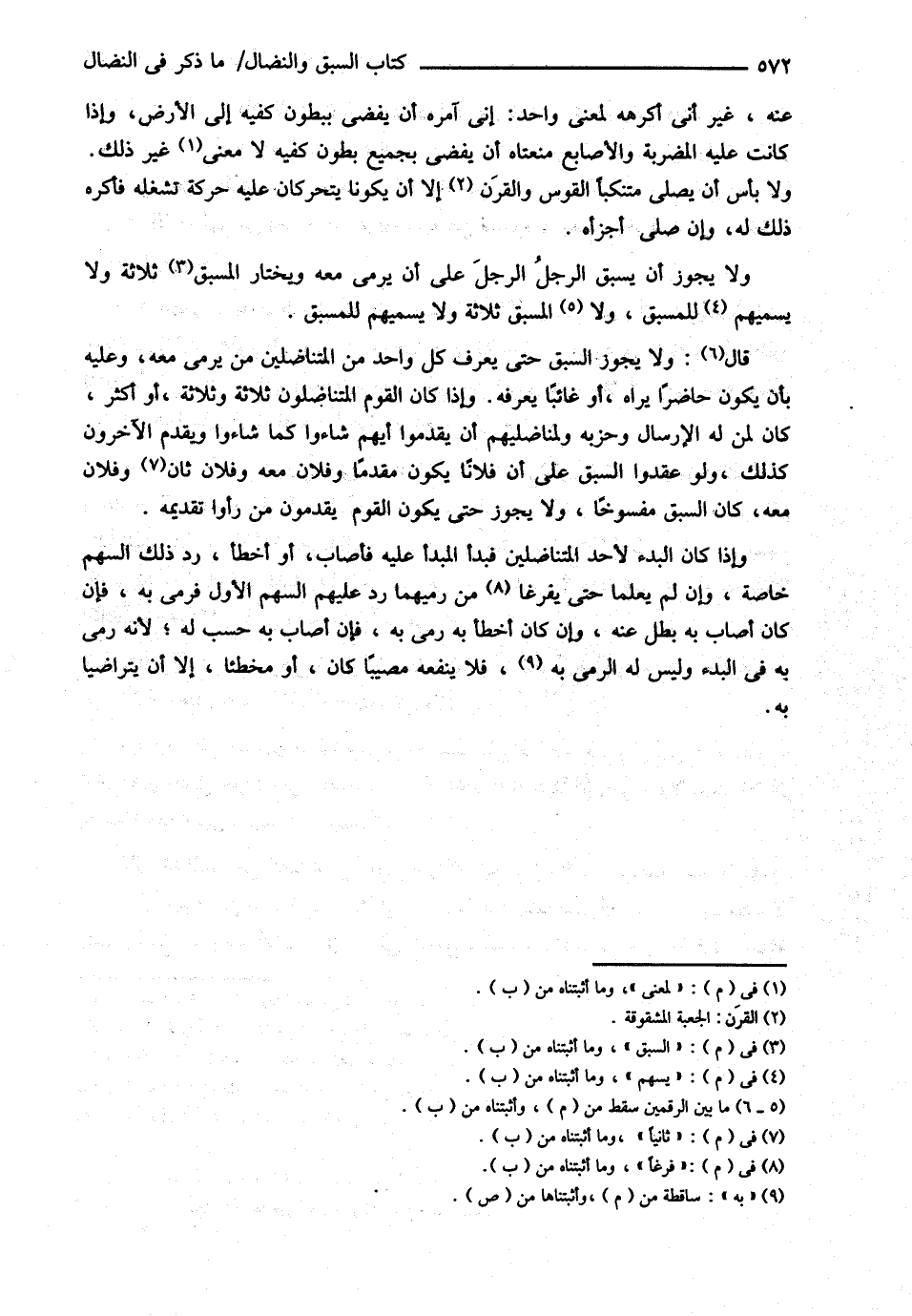وَإِذَا كَانَ الْقَوْمُ الْمُتَنَاضِلُونَ ثَلاَثَةً وَثَلاَثَةً أَوْ أَكْثَرَ كَانَ لِمَنْ لَهُ الْإِرْسَالُ وَحِزْبُهُ وَلِمُنَاضِلِيهِمْ أَنْ يُقَدِّمُوا أَيَّهُمْ شَاءُوا كَمَا شَاءُوا وَيُقَدِّمُ الْآخَرُونَ كَذَلِكَ , وَلَوْ عَقَدُوا السَّبَقَ عَلَى أَنَّ فُلاَنًا يَكُونُ مُقَدَّمًا وَفُلاَنٌ مَعَهُ وَفُلاَنٌ ثَانٍ وَفُلاَنٌ مَعَهُ كَانَ السَّبَقُ مَفْسُوخًا وَلاَ يَجُوزُ حَتَّى يَكُونَ الْقَوْمُ يُقَدِّمُونَ مَنْ رَأَوْا تَقْدِيمَهُ , وَإِذَا كَانَ الْبَدْءُ لِأَحَدٍ الْمُتَنَاضِلِينَ فَبَدَأَ الْمُبْدَأُ عَلَيْهِ فَأَصَابَ أَوْ أَخْطَأَ رُدَّ ذَلِكَ السَّهْمُ خَاصَّةً , وَإِنْ لَمْ يَعْلَمَا حَتَّى يَفْرُغَا مِنْ رَمْيِهِمَا رُدَّ عَلَيْهِ السَّهْمُ الْأَوَّلُ فَرَمَى بِهِ فَإِنْ كَانَ أَصَابَ بِهِ بَطَلَ عَنْهُ وَإِنْ كَانَ أَخْطَأَ بِهِ رَمَى بِهِ فَإِنْ أَصَابَ بِهِ حُسِبَ لَهُ لِأَنَّهُ رَمَى بِهِ فِي الْبَدْءِ وَلَيْسَ لَهُ الرَّمْيُ بِهِ فَلاَ يَنْفَعُهُ مُصِيبًا كَانَ أَوْ مُخْطِئًا إلَّا أَنْ يَتَرَاضَيَا بِهِ .@