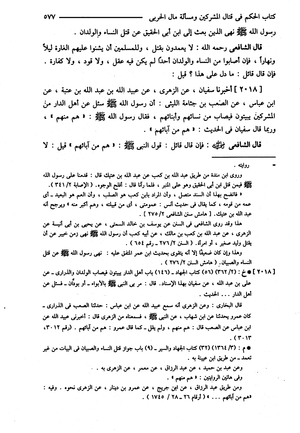 قَالَ الشَّافِعِيُّ : لاَ يَعْمِدُونَ بِقَتْلٍ وَلِلْمُسْلِمِينَ أَنْ يَشُنُّوا عَلَيْهِمْ الْغَارَةَ لَيْلاً وَنَهَارًا فَإِنْ أَصَابُوا مِنْ النِّسَاءِ وَالْوِلْدَانِ أَحَدًا لَمْ يَكُنْ فِيهِ عَقْلٌ وَلاَ قَوَدٌ وَلاَ كَفَّارَةٌ , فَإِنْ قَالَ قَائِلٌ مَا دَلَّ عَلَى هَذَا ؟ قِيلَ أَخْبَرَنَا سُفْيَانُ عَنْ الزُّهْرِيِّ عَنْ عُبَيْدِ اللَّهِ بْنِ عَبْدِ اللَّهِ بْنِ عُتْبَةَ عَنْ ابْنِ عَبَّاسٍ رضي الله تعالى عنهما عَنْ الصَّعْبِ بْنِ جَثَّامَةَ اللَّيْثِيِّ { أَنَّ رَسُولَ اللَّهِ - صلى الله عليه وسلم - سَأَلَ عَنْ أَهْلِ الدَّارِ مِنْ الْمُشْرِكِينَ يَبِيتُونَ فَيُصَابُ مِنْ نِسَائِهِمْ وَأَبْنَائِهِمْ فَقَالَ رَسُولُ اللَّهِ - صلى الله عليه وسلم - هُمْ مِنْهُمْ } وَرُبَّمَا قَالَ سُفْيَانُ فِي الْحَدِيثِ { هُمْ مِنْ آبَائِهِمْ } .