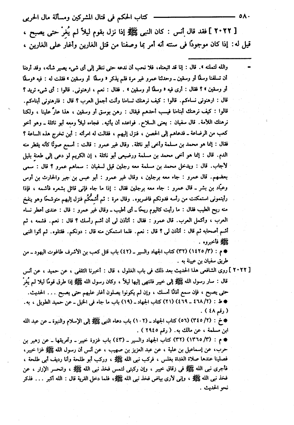 فَقَدْ قَالَ أَنَسٌ { كَانَ النَّبِيُّ - صلى الله عليه وسلم - إذَا نَزَلَ بِقَوْمٍ لَيْلاً لَمْ يُغِرْ حَتَّى يُصْبِحَ } قِيلَ لَهُ إذَا كَانَ مَوْجُودًا فِي سُنَّتِهِ أَنَّهُ أَمَرَ بِمَا وَصَفْنَا مَنْ قَتْلِ الْغَارِّينَ وَأَغَارَ عَلَى الْغَارِّينَ@