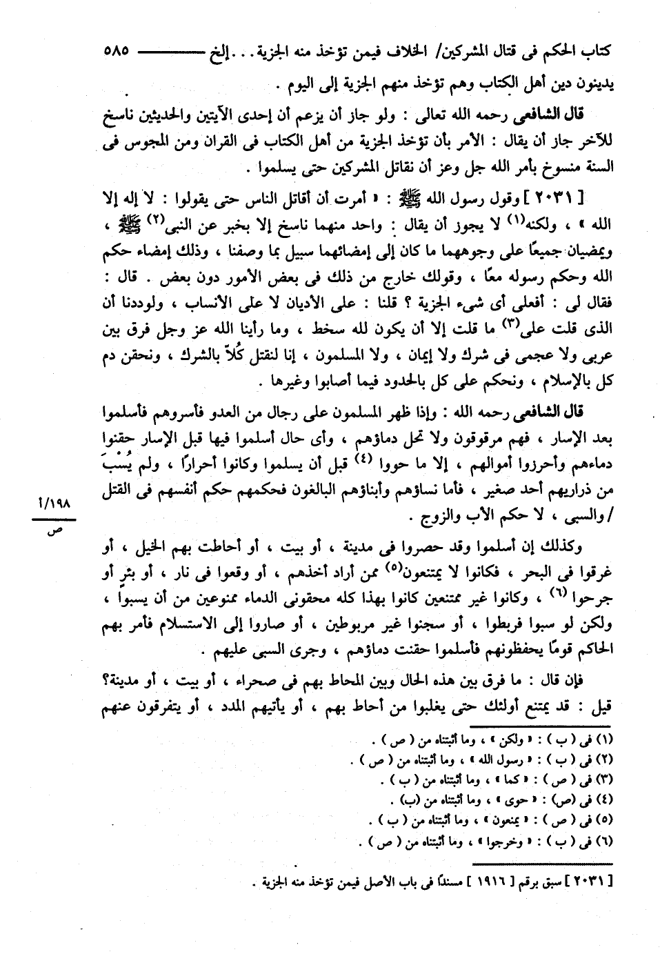 قَالَ الشَّافِعِيُّ : رحمه الله تعالى وَلَوْ جَازَ أَنْ يَزْعُمَ أَنَّ إحْدَى الْآيَتَيْنِ وَالْحَدِيثَيْنِ نَاسِخٌ لِلْآخَرِ جَازَ أَنْ يُقَالَ الْأَمْرُ بِأَنْ تُؤْخَذَ الْجِزْيَةُ مِنْ أَهْلِ الْكِتَابِ فِي الْقُرْآنِ وَمِنْ الْمَجُوسِ فِي السُّنَّةِ مَنْسُوخٌ بِأَمْرِ اللَّهِ عَزَّ وَجَلَّ أَنْ نُقَاتِلَ الْمُشْرِكِينَ حَتَّى يُسْلِمُوا وَقَوْلِ رَسُولِ اللَّهِ - صلى الله عليه وسلم - { أُمِرْتُ أَنْ أُقَاتِلَ النَّاسَ حَتَّى يَقُولُوا لاَ إلَهَ إلَّا اللَّهُ } وَلَكِنْ لاَ يَجُوزُ أَنْ يُقَالَ وَاحِدٌ مِنْهُمَا نَاسِخٌ إلَّا بِخَبَرٍ عَنْ رَسُولِ اللَّهِ - صلى الله عليه وسلم - وَيَمْضِيَانِ جَمِيعًا عَلَى وُجُوهِهِمَا مَا كَانَ إلَى إمْضَائِهِمَا سَبِيلٌ بِمَا وَصَفْنَا وَذَلِكَ إمْضَاءُ حُكْمِ اللَّهِ عَزَّ وَجَلَّ وَحُكْمِ رَسُولِهِ مَعًا وَقَوْلُك خَارِجٌ مِنْ ذَلِكَ فِي بَعْضِ الْأُمُورِ دُونَ بَعْضٍ قَالَ فَقَالَ لِي أَفَعَلَيَّ أَيَّ شَيْءٍ الْجِزْيَةُ ؟ قُلْنَا عَلَى الْأَدْيَانِ لاَ عَلَى الْأَنْسَابِ وَلَوَدِدْنَا أَنَّ الَّذِي قُلْت عَلَى مَا قُلْت إلَّا أَنْ يَكُونَ لِلَّهِ سَخَطٌ وَمَا رَأَيْنَا اللَّهَ عَزَّ وَجَلَّ فَرَّقَ بَيْنَ عَرَبِيٍّ وَلاَ عَجَمِيٍّ فِي شِرْكٍ وَلاَ إيمَانٍ وَلاَ الْمُسْلِمُونَ أَنَّا لَنَقْتُلُ كُلًّا بِالشِّرْكِ وَنَحْقِنُ دَمَ كُلِّ بِالْإِسْلاَمِ وَنَحْكُمُ عَلَى كُلٍّ بِالْحُدُودِ فِيمَا أَصَابُوا وَغَيْرَهَا
