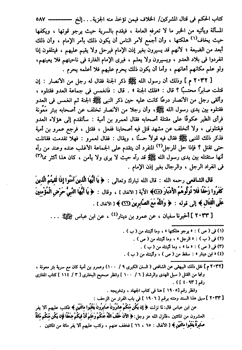 قَالَ الشَّافِعِيُّ : رحمه الله تعالى قَالَ اللَّهُ تَبَارَكَ وَتَعَالَى { يَا أَيُّهَا الَّذِينَ آمَنُوا إذَا لَقِيتُمْ الَّذِينَ كَفَرُوا زَحْفًا فَلاَ تُوَلُّوهُمْ الْأَدْبَارَ ? الآيَةَ. وَقَالَ { يَا أَيُّهَا النَّبِيُّ حَرِّضْ الْمُؤْمِنِينَ عَلَى الْقِتَالِ } إلَى قَوْلِهِ { وَاَللَّهُ مَعَ الصَّابِرِينَ } أَخْبَرَنَا سُفْيَانُ عَنْ عَمْرِو بْنِ دِينَارٍ عَنْ ابْنِ عَبَّاسٍ رضي الله عنهما .@