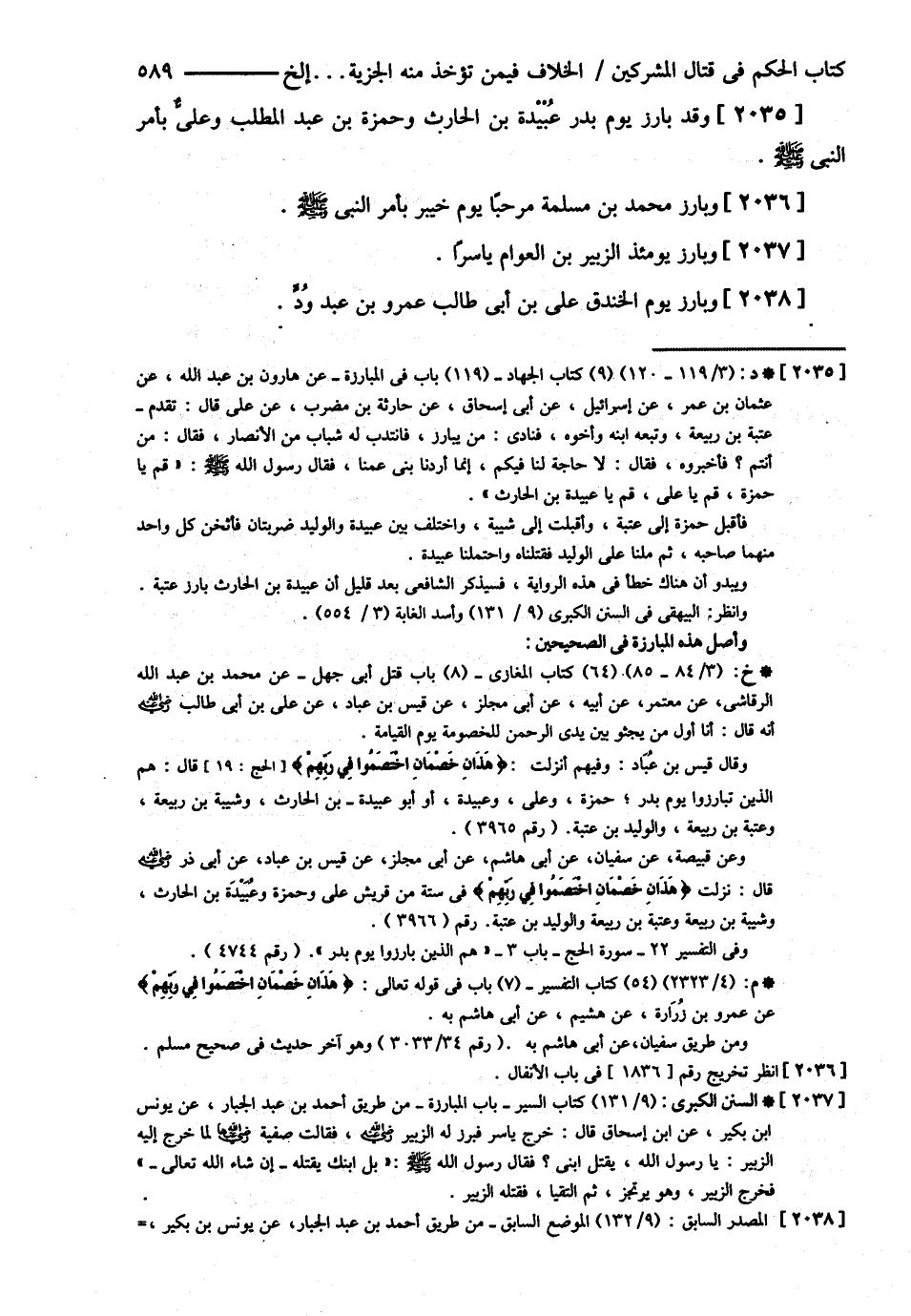 وَقَدْ بَارَزَ يَوْمَ بَدْرٍ عُبَيْدَةُ بْنُ الْحَارِثِ وَحَمْزَةُ بْنُ عَبْدِ الْمُطَّلِبِ وَعَلِيٌّ بِأَمْرِ النَّبِيِّ - صلى الله عليه وسلم - وَبَارَزَ مُحَمَّدُ بْنُ مَسْلَمَةَ مُرَحِّبًا يَوْمَ خَيْبَرَ بِأَمْرِ النَّبِيِّ - صلى الله عليه وسلم - وَبَارَزَ يَوْمَئِذٍ الزُّبَيْرَ بْنَ الْعَوَّامِ يَاسِرًا وَبَارِز يَوْم الْخَنْدَقِ عَلِيُّ بْنُ أَبِي طَالِبٍ عَمْرَو بْنَ عَبْدِ وُدٍّ @