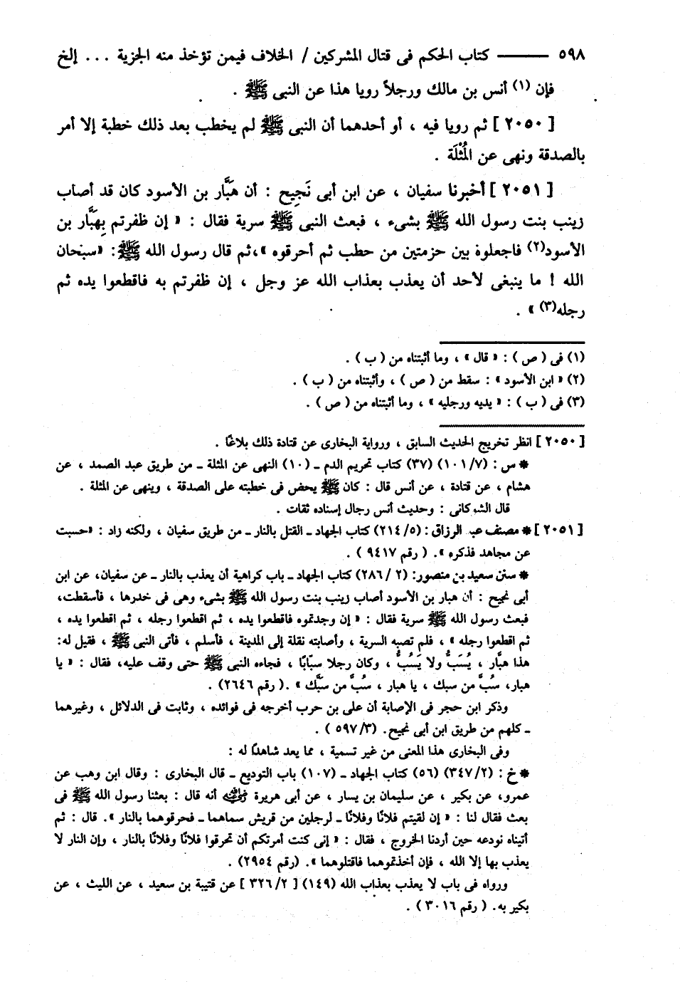 فَإِنَّ أَنَسَ بْنَ مَالِكٍ وَرَجُلاً رَوَيَا هَذَا عَنْ النَّبِيِّ - صلى الله عليه وسلم - ثُمَّ رَوَيَا فِيهِ أَوْ أَحَدُهُمَا أَنَّ النَّبِيَّ - صلى الله عليه وسلم - لَمْ يَخْطُبْ بَعْدَ ذَلِكَ خُطْبَةً إلَّا أَمَرَ بِالصَّدَقَةِ وَنَهَى عَنْ الْمُثْلَةِ , أَخْبَرَنَا سُفْيَانُ عَنْ ابْنِ أَبِي نَجِيحٍ { أَنَّ هَبَّارَ بْنَ الْأَسْوَدِ كَانَ قَدْ أَصَابَ زَيْنَبَ بِنْتِ رَسُولِ اللَّهِ - صلى الله عليه وسلم - بِشَيْءٍ فَبَعَثَ النَّبِيُّ - صلى الله عليه وسلم - سَرِيَّةً فَقَالَ إنْ ظَفِرْتُمْ بِهَبَّارِ بْنِ الْأَسْوَدِ فَاجْعَلُوهُ بَيْنَ حُزْمَتَيْنِ مِنْ حَطَبٍ ثُمَّ أَحْرَقُوهُ ثُمَّ قَالَ رَسُولُ اللَّهِ - صلى الله عليه وسلم - سُبْحَانَ اللَّهِ مَا يَنْبَغِي لِأَحَدٍ أَنْ يُعَذِّبَ بِعَذَابِ اللَّهِ عَزَّ وَجَلَّ إنْ ظَفِرْتُمْ بِهِ فَاقْطَعُوا يَدَيْهِ وَرِجْلَيْهِ } .@