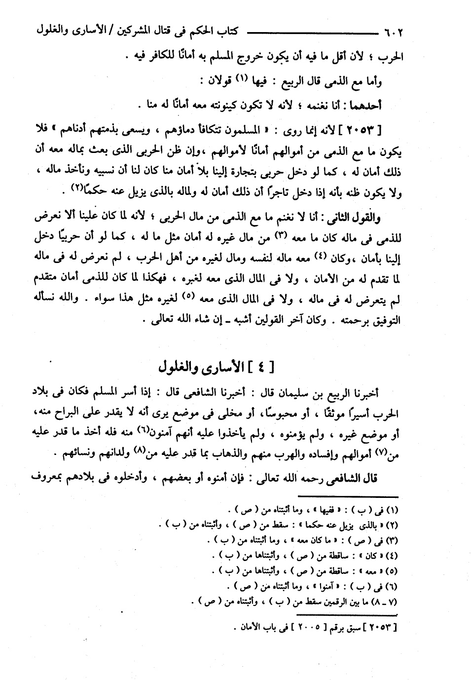 الْحَرْبِ لِأَنَّ أَقَلَّ مَا فِيهِ أَنْ يَكُونَ خُرُوجُ الْمُسْلِمِ بِهِ أَمَانًا لِلْكَافِرِ فِيهِ وَأَمَّا مَعَ الذِّمِّيِّ قَالَ الرَّبِيعُ " فَفِيهَا قَوْلاَنِ أَحَدُهُمَا أَنَّا نَغْنَمُهُ لِأَنَّهُ لاَ تَكُونُ كَيْنُونَتُهُ مَعَهُ أَمَانًا لَهُ مِنَّا لِأَنَّهُ إنَّمَا رُوِيَ { الْمُسْلِمُونَ تَتَكَافَأُ دِمَاؤُهُمْ وَيَسْعَى بِذِمَّتِهِمْ أَدْنَاهُمْ } فَلاَ يَكُونُ مَا مَعَ الذِّمِّيِّ مِنْ أَمْوَالِهِمْ أَمَانًا لِأَمْوَالِهِمْ وَإِنْ ظَنَّ الْحَرْبِيُّ الَّذِي بَعَثَ بِمَالِهِ مَعَهُ أَنَّ ذَلِكَ أَمَانٌ لَهُ كَمَا لَوْ دَخَلَ حَرْبِيٌّ بِتِجَارَةٍ إلَيْنَا بِلاَ أَمَانٍ مِنَّا كَانَ لَنَا أَنْ نَسْبِيَهُ وَنَأْخُذَ مَالَهُ وَلاَ يَكُونُ ظَنُّهُ بِأَنَّهُ إذَا دَخَلَ تَاجِرًا أَنَّ ذَلِكَ أَمَانٌ لَهُ وَلِمَالِهِ بِاَلَّذِي يُزِيلُ عَنْهُ حُكْمًا وَالْقَوْلُ الثَّانِي أَنَّا لاَ نَغْنَمُ مَا مَعَ الذِّمِّيِّ مِنْ مَالِ الْحَرْبِيِّ لِأَنَّهُ لَمَّا كَانَ عَلَيْنَا أَنْ لاَ نَعْرِضَ لِلذِّمِّيِّ فِي مَالِهِ كَانَ مَا مَعَهُ مِنْ مَالِ غَيْرِهِ لَهُ أَمَانٌ مِثْلُ مَالِهِ كَمَا لَوْ أَنَّ حَرْبِيًّا دَخَلَ إلَيْنَا بِأَمَانٍ وَكَانَ مَعَهُ مَالٌ لِنَفْسِهِ وَمَالٌ لِغَيْرِهِ مِنْ أَهْلِ الْحَرْبِ لَمْ نَعْرِضْ لَهُ فِي مَالِهِ لِمَا تَقَدَّمَ لَهُ مِنْ الْأَمَانِ وَلاَ فِي الْمَالِ الَّذِي مَعَهُ لِغَيْرِهِ فَهَكَذَا لَمَّا كَانَ لِلذِّمِّيِّ أَمَانٌ مُتَقَدِّمٌ لَمْ يُتَعَرَّضْ لَهُ فِي مَالِهِ وَلاَ فِي الْمَالِ الَّذِي مَعَهُ لِغَيْرِهِ مِثْلُ هَذَا سَوَاءٌ . وَاَللَّهَ نَسْأَلُ التَّوْفِيقَ بِرَحْمَتِهِ . وَكَانَ آخِرُ الْقَوْلَيْنِ أَشْبَهَ إنْ شَاءَ اللَّهُ تَعَالَى .