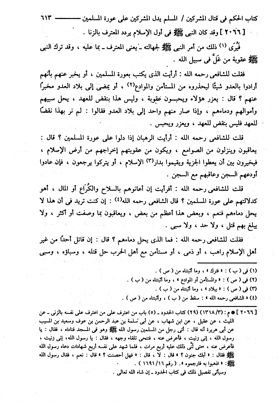 وَقَدْ كَانَ النَّبِيُّ - صلى الله عليه وسلم - فِي أَوَّلِ الْإِسْلاَمِ يُرَدِّدُ الْمُعْتَرِفَ بِالزِّنَا فَتَرَكَ ذَلِكَ مِنْ أَمْرِ النَّبِيِّ - صلى الله عليه وسلم - لِجَهَالَتِهِ يَعْنِي الْمُعْتَرِفُ بِمَا عَلَيْهِ وَقَدْ تَرَكَ النَّبِيُّ - صلى الله عليه وسلم - عُقُوبَةَ مَنْ غَلَّ فِي سَبِيلِ اللَّهِ فَقُلْت لِلشَّافِعِيِّ : أَرَأَيْت الَّذِي يَكْتُبُ بِعَوْرَةِ الْمُسْلِمِينَ أَوْ يُخْبِرُ عَنْهُمْ بِأَنَّهُمْ أَرَادُوا بِالْعَدُوِّ شَيْئًا لِيَحْذَرُوهُ مِنْ الْمُسْتَأْمَنِ وَالْمُوَادِعِ أَوْ يَمْضِي إلَى بِلاَدِ الْعَدُوِّ مُخْبِرًا عَنْهُمْ قَالَ : يُعَزَّرُ هَؤُلاَءِ وَيُحْبَسُونَ عُقُوبَةً وَلَيْسَ هَذَا بِنَقْضٍ لِلْعَهْدِ يُحِلُّ سَبْيَهُمْ وَأَمْوَالَهُمْ وَدِمَاءَهُمْ وَإِذَا صَارَ مِنْهُمْ وَاحِدٌ إلَى بِلاَدِ الْعَدُوِّ فَقَالُوا : لَمْ نَرَ بِهَذَا نَقْضًا لِلْعَهْدِ فَلَيْسَ بِنَقْضٍ لِلْعَهْدِ وَيُعَزَّرُ وَيُحْبَسُ قُلْت لِلشَّافِعِيِّ أَرَأَيْت الرُّهْبَانَ إذَا دَلُّوا عَلَى عَوْرَةِ الْمُسْلِمِينَ ؟ قَالَ : يُعَاقَبُونَ وَيَنْزِلُونَ مِنْ الصَّوَامِعِ وَيَكُونُ مِنْ عُقُوبَتِهِمْ إخْرَاجُهُمْ مِنْ أَرْضِ الْإِسْلاَمِ فَيُخَيَّرُونَ بَيْنَ أَنْ يُعْطُوا الْجِزْيَةَ وَيُقِيمُوا بِدَارِ الْإِسْلاَمِ أَوْ يُتْرَكُوا يَرْجِعُونَ فَإِنْ عَادُوا أَوْدَعَهُمْ السَّجْنَ وَعَاقَبَهُمْ مَعَ السَّجْنِ قُلْت لِلشَّافِعِيِّ : أَفَرَأَيْت إنْ أَعَانُوهُمْ بِالسِّلاَحِ وَالْكُرَاعِ أَوْ الْمَالِ أَهُوَ كَدَلاَلَتِهِمْ عَلَى عَوْرَةِ الْمُسْلِمِينَ ؟ قَالَ : إنْ كُنْت تُرِيدُ فِي أَنَّ هَذَا لاَ يُحِلُّ دِمَاءَهُمْ فَنَعَمْ وَبَعْضُ هَذَا أَعْظَمُ مِنْ بَعْضٍ وَيُعَاقَبُونَ بِمَا وَصَفْت أَوْ أَكْثَرُ وَلاَ يَبْلُغُ بِهِمْ قَتْلٌ وَلاَ حَدٌّ وَلاَ سَبْيٌ فَقُلْت لِلشَّافِعِيِّ فَمَا الَّذِي يُحِلُّ دِمَاءَهُمْ ؟ قَالَ : إنْ قَاتَلَ أَحَدٌ مِنْ غَيْرِ أَهْلِ الْإِسْلاَمِ رَاهِبٌ أَوْ ذِمِّيٌّ أَوْ مُسْتَأْمَنٌ مَعَ أَهْلِ الْحَرْبِ حَلَّ قَتْلُهُ وَسِبَاؤُهُ وَسَبْيُ@