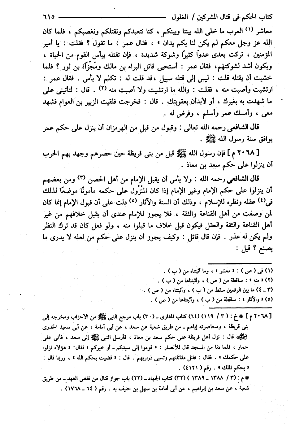 قَالَ الشَّافِعِيُّ : رحمه الله تعالى : وَقَبُولُ مَنْ قَبِلَ مِنْ الْهُرْمُزَانِ أَنْ يَنْزِلَ عَلَى حُكْمِ عُمَرَ يُوَافِقُ سُنَّةَ رَسُولِ اللَّهِ - صلى الله عليه وسلم - فَإِنَّ رَسُولَ اللَّهِ - صلى الله عليه وسلم - قَبِلَ مِنْ بَنِي قُرَيْظَةَ حِينَ حَصَرَهُمْ وَجَهِدَ بِهِمْ الْحَرْبُ أَنْ يَنْزِلُوا عَلَى حُكْمِ سَعْدِ بْنِ مُعَاذٍ