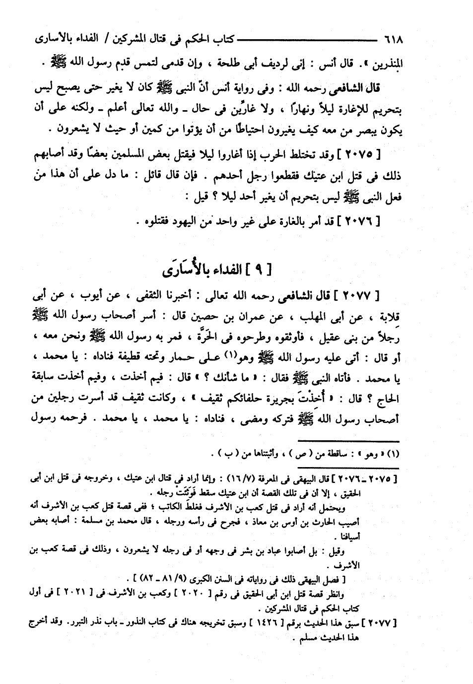 قَالَ الشَّافِعِيُّ : رحمه الله تعالى : أَخْبَرَنَا الثَّقَفِيُّ عَنْ أَيُّوبَ عَنْ أَبِي قِلاَبَةَ عَنْ أَبِي الْمُهَلَّبِ عَنْ عِمْرَانَ بْنِ حُصَيْنٍ قَالَ { أَسَرَ أَصْحَابُ رَسُولِ اللَّهِ - صلى الله عليه وسلم - رَجُلاً مِنْ بَنِي عَقِيلٍ فَأَوْثَقُوهُ وَطَرَحُوهُ فِي الْحَرَّةِ فَمَرَّ بِهِ رَسُولُ اللَّهِ - صلى الله عليه وسلم - وَنَحْنُ مَعَهُ أَوْ قَالَ أَتَى عَلَيْهِ رَسُولُ اللَّهِ - صلى الله عليه وسلم - وَهُوَ عَلَى حِمَارٍ وَتَحْتَهُ قَطِيفَةٌ فَنَادَاهُ يَا مُحَمَّدُ يَا مُحَمَّدُ فَأَتَاهُ النَّبِيُّ - صلى الله عليه وسلم - فَقَالَ : مَا شَأْنك قَالَ : فِيمَ أُخِذْت وَفِيمَ أَخَذْت سَابِقَةَ الْحَاجِّ ؟ قَالَ أُخِذْت بِجَرِيرَةِ حُلَفَائِكُمْ ثَقِيفٍ وَكَانَتْ ثَقِيفٌ قَدْ أَسَرَتْ رَجُلَيْنِ مِنْ أَصْحَابِ رَسُولِ اللَّهِ - صلى الله عليه وسلم - فَتَرَكَهُ وَمَضَى فَنَادَاهُ يَا مُحَمَّدُ يَا مُحَمَّدُ فَرَحِمَهُ رَسُولُ@