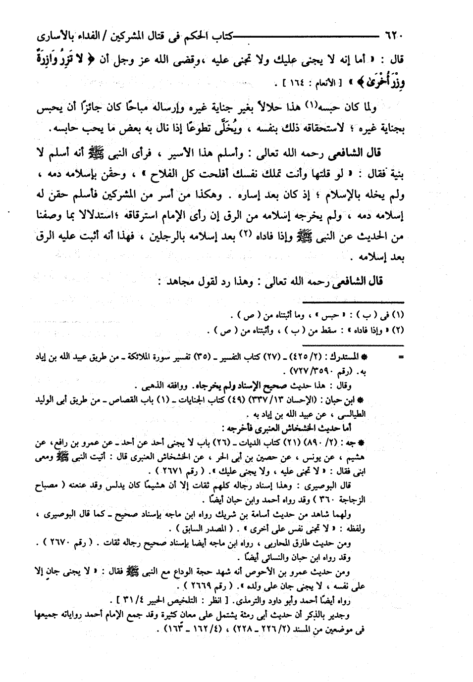 قَالَ أَمَّا إنَّهُ لاَ يَجْنِي عَلَيْك وَلاَ تَجْنِي عَلَيْهِ وَقَضَى اللَّهُ عَزَّ وَجَلَّ أَنْ لاَ تَزِرُ وَازِرَةٌ وِزْرَ أُخْرَى } وَلَمَّا كَانَ حَبْسُ هَذَا حَلاَلاً بِغَيْرِ جِنَايَةِ غَيْرِهِ وَإِرْسَالُهُ مُبَاحًا كَانَ جَائِزًا أَنْ يُحْبَسَ بِجِنَايَةِ غَيْرِهِ لِاسْتِحْقَاقِهِ ذَلِكَ بِنَفْسِهِ وَيُخْلَى تَطَوُّعًا إذَا نَالَ بِهِ بَعْضَ مَا يُحِبُّ حَابِسُهُ