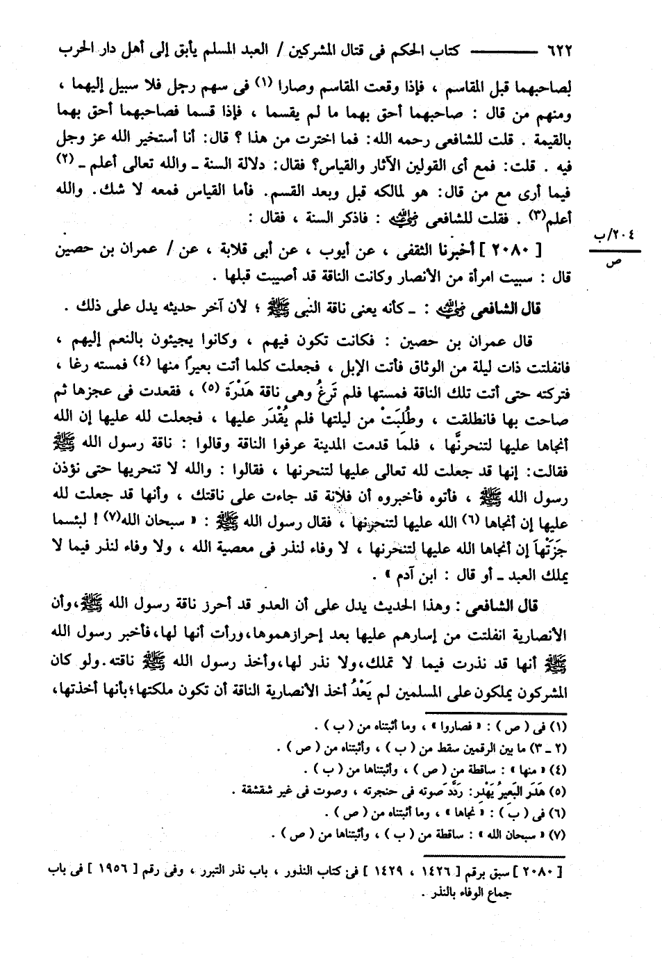 قَالَ الشَّافِعِيُّ : رحمه الله تعالى : كَأَنَّهُ يَعْنِي نَاقَةَ النَّبِيِّ - صلى الله عليه وسلم - لِأَنَّ آخِرَ حَدِيثِهِ يَدُلُّ عَلَى ذَلِكَ قَالَ عِمْرَانُ بْنُ حُصَيْنٍ { : فَكَانَتْ تَكُونُ فِيهِمْ وَكَانُوا يَجِيئُونَ بِالنَّعَمِ إلَيْهِمْ فَانْفَلَتَتْ ذَاتَ لَيْلَةٍ مِنْ الْوَثَاقِ فَأَتَتْ الْإِبِلَ فَجَعَلَتْ كُلَّمَا أَتَتْ بَعِيرًا مِنْهَا فَمَسَّتْهُ رَغَا فَتَرَكَتْهُ حَتَّى أَتَتْ تِلْكَ النَّاقَةَ فَمَسَّتْهَا فَلَمْ تَرْغُ وَهِيَ نَاقَةٌ هَدَرَةٌ فَقَعَدَتْ فِي عَجُزِهَا ثُمَّ صَاحَتْ بِهَا فَانْطَلَقَتْ وَطُلِبَتْ مِنْ لَيْلَتِهَا فَلَمْ يُقْدَرْ عَلَيْهَا فَجَعَلَتْ لِلَّهِ عَلَيْهَا إنْ اللَّهُ أَنْجَاهَا عَلَيْهَا لَتَنْحَرَنَّهَا فَلَمَّا قَدِمَتْ الْمَدِينَةَ عَرَفُوا النَّاقَةَ وَقَالُوا : نَاقَةُ رَسُولِ اللَّهِ - صلى الله عليه وسلم - فَقَالَتْ : إنَّهَا قَدْ جَعَلَتْ لِلَّهِ تَعَالَى عَلَيْهَا لَتَنْحَرَنَّهَا فَقَالُوا وَاَللَّهِ لاَ تَنْحَرِيهَا حَتَّى نُؤْذِنَ رَسُولَ اللَّهِ - صلى الله عليه وسلم - فَأَتَوْهُ فَأَخْبَرُوهُ أَنَّ فُلاَنَةَ قَدْ جَاءَتْ عَلَى نَاقَتِك وَأَنَّهَا قَدْ جَعَلَتْ لِلَّهِ عَلَيْهَا إنْ نَجَّاهَا اللَّهُ عَلَيْهَا لَتَنْحَرَنَّهَا فَقَالَ رَسُولُ اللَّهِ - صلى الله عليه وسلم - لَبِئْسَ مَا جَزَتْهَا إنْ أَنْجَاهَا اللَّهُ عَلَيْهَا لَتَنْحَرَنَّهَا لاَ وَفَاءَ لِنَذْرٍ فِي مَعْصِيَةِ اللَّهِ وَلاَ وَفَاءَ لِنَذْرٍ فِيمَا لاَ يَمْلِكُ الْعَبْدُ أَوْ قَالَ ابْنُ آدَمَ }