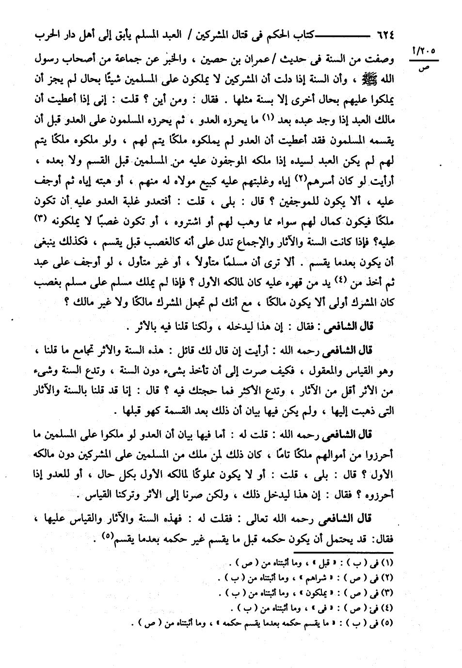 وَصَفْت مِنْ السُّنَّةِ فِي حَدِيثِ عِمْرَانَ بْنِ حُصَيْنٍ وَالْخَبَرُ عَنْ جَمَاعَةٍ مِنْ أَصْحَابِ رَسُولِ اللَّهِ - صلى الله عليه وسلم - وَأَنَّ السُّنَّةَ إذَا دَلَّتْ أَنَّ الْمُشْرِكِينَ لاَ يَمْلِكُونَ عَلَى الْمُسْلِمِينَ شَيْئًا بِحَالٍ لَمْ يَجُزْ أَنْ يَمْلِكُوا عَلَيْهِمْ بِحَالٍ أُخْرَى إلَّا بِسُنَّةٍ مِثْلِهَا . فَقَالَ وَمِنْ أَيْنَ ؟ قُلْت : إنِّي إذَا أَعْطَيْت أَنَّ مَالِكَ الْعَبْدِ إذَا وَجَدَ عَبْدَهُ قَبْلَ مَا يُحْرِزُهُ الْعَدُوُّ ثُمَّ يُحْرِزُهُ الْمُسْلِمُونَ عَلَى الْعَدُوِّ قَبْلَ أَنْ يَقْسِمَهُ الْمُسْلِمُونَ فَقَدْ أَعْطَيْت أَنَّ الْعَدُوَّ لَمْ يَمْلِكُوهُ مِلْكًا يَتِمُّ لَهُمْ وَلَوْ مَلَكُوهُ مِلْكًا يَتِمُّ لَهُمْ لَمْ يَكُنْ الْعَبْدُ لِسَيِّدِهِ إذَا مَلَكَهُ الموجفون عَلَيْهِ مِنْ الْمُسْلِمِينَ قَبْلَ الْقَسْمِ وَلاَ بَعْدَهُ أَرَأَيْت لَوْ كَانَ أَسْرُهُمْ إيَّاهُ وَغَلَبَتُهُمْ عَلَيْهِ كَبَيْعِ مَوْلاَهُ لَهُ مِنْهُمْ أَوْ هِبَتِهِ إيَّاهُ ثُمَّ أَوْجَفَ عَلَيْهِ أَلَّا يَكُونَ لِلْمُوجِفِينَ ؟ قَالَ : بَلَى قُلْت : أَفَتَعْدُو غَلَبَةُ الْعَدُوِّ عَلَيْهِ أَنْ تَكُونَ مِلْكًا فَيَكُونُ كَمَالٍ لَهُمْ سَوَاءٌ مِمَّا وُهِبَ لَهُمْ أَوْ اشْتَرَوْهُ أَوْ تَكُونُ غَصْبًا لاَ يَمْلِكُونَهُ عَلَيْهِ ؟ فَإِذَا كَانَتْ السُّنَّةُ وَالْآثَارُ وَالْإِجْمَاعُ تَدُلُّ عَلَى أَنَّهُ كَالْغَصْبِ قَبْلَ أَنْ يُقْسَمَ فَكَذَلِكَ يَنْبَغِي أَنْ يَكُونَ بَعْدَمَا يُقْسَمُ , أَلاَ تَرَى أَنَّ مُسْلِمًا مُتَأَوِّلاً أَوْ غَيْرَ مُتَأَوِّلٍ لَوْ أَوْجَفَ عَلَى عَبْدٍ ثُمَّ أُخِذَ مِنْ يَدِ مَنْ قَهَرَهُ عَلَيْهِ كَانَ لِمَالِكِهِ الْأَوَّلِ فَإِذَا لَمْ يَمْلِكْ مُسْلِمٌ عَلَى مُسْلِمٍ بِغَصْبٍ كَانَ الْمُشْرِكُ أَوْلَى أَنْ لاَ يَكُونَ مَالِكًا مَعَ أَنَّك لَمْ تَجْعَلْ الْمُشْرِكَ مَالِكًا وَلاَ غَيْرَ مَالِكٍ