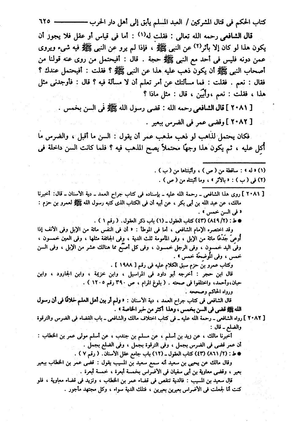 قَالَ الشَّافِعِيُّ : قَضَى رَسُولُ اللَّهِ - صلى الله عليه وسلم - فِي السِّنِّ بِخَمْسٍ وَقَضَى عُمَرُ فِي الضِّرْسِ بِبَعِيرٍ فَكَانَ يَحْتَمِلُ لِذَاهِبٍ لَوْ ذَهَبَ مَذْهَبَ عُمَرَ أَنْ يَقُولَ السِّنُّ مَا أَقْبَلَ وَالضِّرْسُ مَا أَكَلَ عَلَيْهِ ثُمَّ يَكُونُ هَذَا وَجْهًا مُحْتَمَلاً يَصِحُّ الْمَذْهَبُ فِيهِ ؟ فَلَمَّا كَانَتْ السِّنُّ دَاخِلَةً فِي@