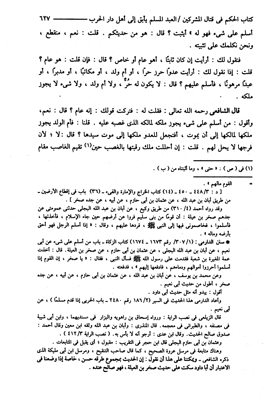 قَالَ الشَّافِعِيُّ : أَرَأَيْت مَا رَوَيْت عَنْ النَّبِيِّ - صلى الله عليه وسلم - مِنْ أَنَّهُ مَنْ أَسْلَمَ عَلَى شَيْءٍ فَهُوَ لَهُ " أَيَثْبُتُ ؟ قَالَ هُوَ مِنْ حَدِيثِكُمْ قُلْت نَعَمْ مُنْقَطِعٌ وَنَحْنُ نُكَلِّمُك عَلَى تَثْبِيتِهِ فَنَقُولُ لَك أَرَأَيْت إنْ كَانَ ثَابِتًا أَهُوَ عَامٌّ أَوْ خَاصٌّ ؟ قَالَ : فَإِنْ قُلْت هُوَ عَامٌّ ؟ قُلْت : إذَا نَقُولُ لَك أَرَأَيْت عَدُوًّا أَحْرَزَ حُرًّا أَوْ أُمَّ وَلَدٍ أَوْ مُكَاتَبًا أَوْ مُدَبَّرًا أَوْ عَبْدًا مَرْهُونًا فَأَسْلَمَ عَلَيْهِمْ ؟ قَالَ : لاَ يَكُونُ لَهُ حُرٌّ وَلاَ أُمُّ وَلَدٍ وَلاَ شَيْءَ لاَ يَجُوزُ مِلْكُهُ
