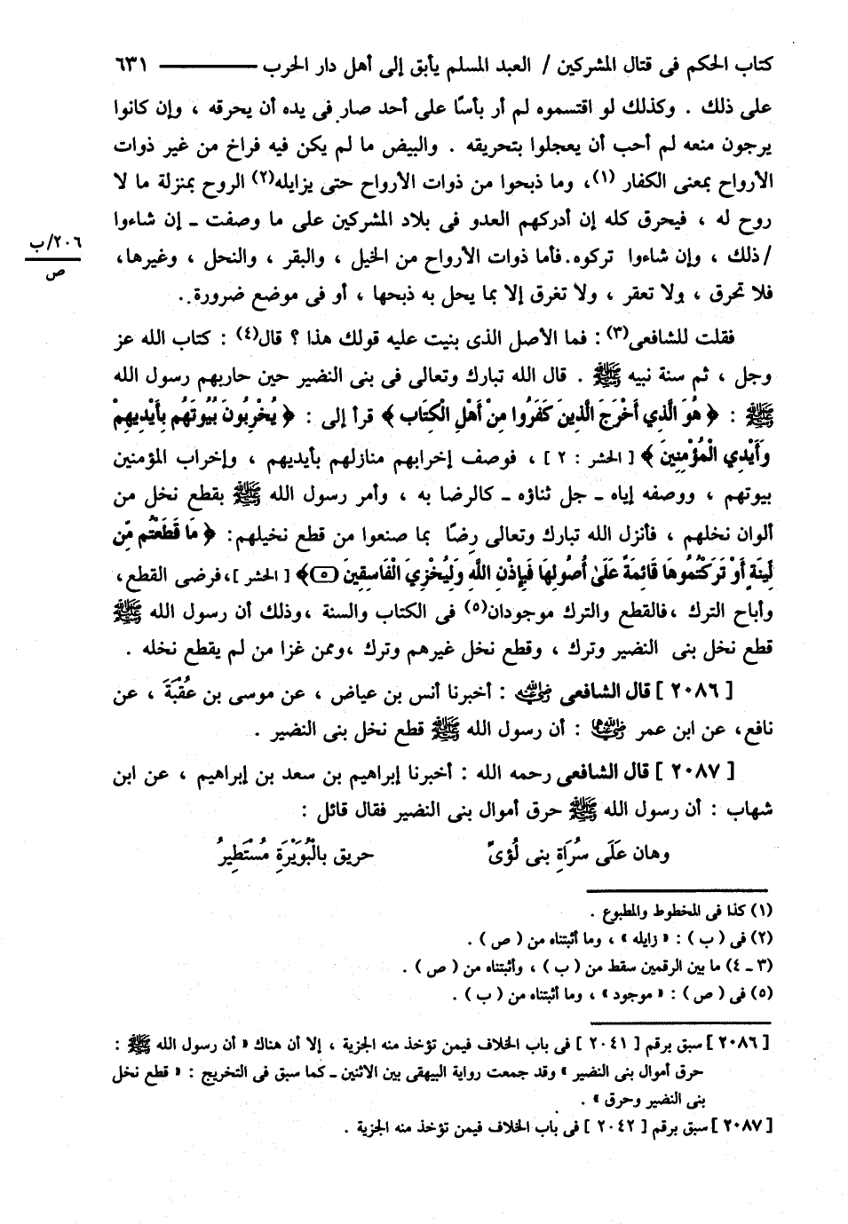 قَالَ الشَّافِعِيُّ: أَخْبَرَنَا إبْرَاهِيمُ بْنُ سَعْدِ بْنِ إبْرَاهِيمَ عَنْ ابْنِ شِهَابٍ {أَنَّ رَسُولَ اللَّهِ - صلى الله عليه وسلم - حَرَّقَ أَمْوَالَ بَنِي النَّضِيرِ فَقَالَ قَائِلٌ:: وَهَانَ عَلَى سَرَاةِ بَنِي لُؤَيٍّ حَرِيقٌ بِالْبُوَيْرَةِ مُسْتَطِيرُ} @