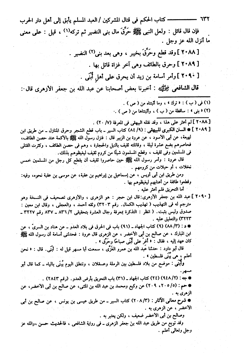 فَإِنْ قَالَ قَائِلٌ : وَلَعَلَّ النَّبِيَّ - صلى الله عليه وسلم - حَرَّقَ مَالَ بَنِي النَّضِيرِ ثُمَّ تَرَكَ قِيلَ عَلَى مَعْنَى مَا أَنْزَلَ اللَّهُ عَزَّ وَجَلَّ وَقَدْ قَطَعَ وَحَرَّقَ بِخَيْبَرَ وَهِيَ بَعْدَ النَّضِيرِ وَحَرَّقَ بِالطَّائِفِ وَهِيَ آخِرُ غُزَاةٍ قَاتَلَ بِهَا وَأَمَرَ أُسَامَةَ بْنَ زَيْدٍ أَنْ يُحَرِّقَ عَلَى أَهْلِ أُبْنَى
