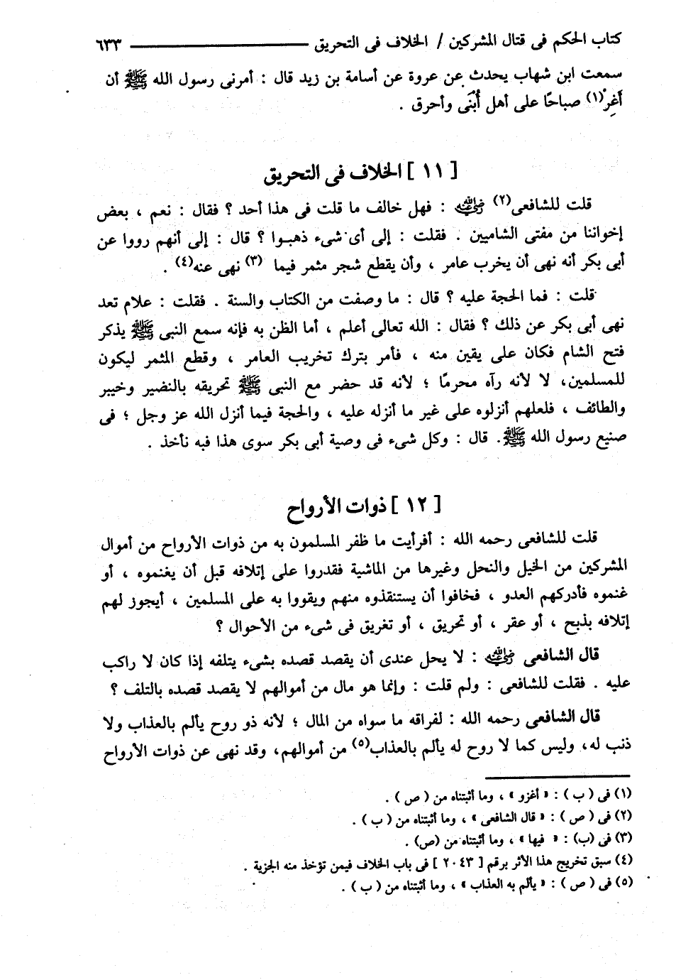 قَالَ الشَّافِعِيُّ: رحمه الله تعالى أَخْبَرَنَا بَعْضُ أَصْحَابِنَا عَنْ عَبْدِ اللَّهِ بْنِ جَعْفَرٍ الْأَزْهَرِيِّ قَالَ: سَمِعْت ابْنَ شِهَابٍ يُحَدِّثُ عَنْ عُرْوَةَ عَنْ أُسَامَة بْنَ زَيْدٍ قَالَ {: أَمَرَنِي رَسُولُ اللَّهِ - صلى الله عليه وسلم - أَنْ أَغْزُوَ صَبَاحًا عَلَى أَهْلِ أُبْنَى وَأُحَرِّقَ.} الْخِلاَفُ فِي التَّحْرِيقِ قُلْت لِلشَّافِعِيِّ رحمه الله تعالى: فَهَلْ خَالَفَ مَا قُلْت فِي هَذَا أَحَدٌ؟ فَقَالَ: نَعَمْ بَعْضُ إخْوَانِنَا مِنْ مُفْتِي الشَّامِيِّينَ فَقُلْت: إلَى أَيِّ شَيْءٍ ذَهَبُوا؟ قَالَ: إلَى أَنَّهُمْ رَوَوْا عَنْ أَبِي بَكْرٍ أَنَّهُ نَهَى أَنْ يُخَرَّبَ عَامِرٌ وَأَنْ يُقْطَعَ شَجَرٌ مُثْمِرٌ فِيهَا فِيمَا نَهَى عَنْهُ قُلْت: فَمَا الْحُجَّةِ عَلَيْهِ؟ قَالَ: مَا وَصَفْت مِنْ الْكِتَابِ وَالسُّنَّةِ فَقُلْت: عَلاَمَ تَعُدُّ نَهْيَ أَبِي بَكْرٍ عَنْ ذَلِكَ؟ فَقَالَ اللَّهُ تَعَالَى أَعْلَمُ أَمَّا الظَّنُّ بِهِ فَإِنَّهُ سَمِعَ النَّبِيَّ - صلى الله عليه وسلم - يَذْكُرُ فَتْحَ الشَّامِ فَكَانَ عَلَى يَقِينٍ مِنْهُ فَأَمَرَ بِتَرْكِ تَخْرِيبِ الْعَامِرِ وَقَطْعِ الْمُثْمِرِ لِيَكُونَ لِلْمُسْلِمِينَ لاَ لِأَنَّهُ رَآهُ مُحَرَّمًا لِأَنَّهُ قَدْ حَضَرَ مَعَ النَّبِيِّ - صلى الله عليه وسلم - تَحْرِيقَهُ بِالنَّضِيرِ وَخَيْبَرَ وَالطَّائِفِ فَلَعَلَّهُمْ أَنْزَلُوهُ عَلَى غَيْرِ مَا أَنْزَلَهُ عَلَيْهِ وَالْحُجَّةُ فِيمَا أَنْزَلَ اللَّهُ عَزَّ وَجَلَّ فِي صَنِيعِ رَسُولِ اللَّهِ - صلى الله عليه وسلم - قَالَ: وَكُلُّ شَيْءٍ فِي وَصِيَّةِ أَبِي بَكْرٍ سِوَى هَذَا فِيهِ نَأْخُذُ.