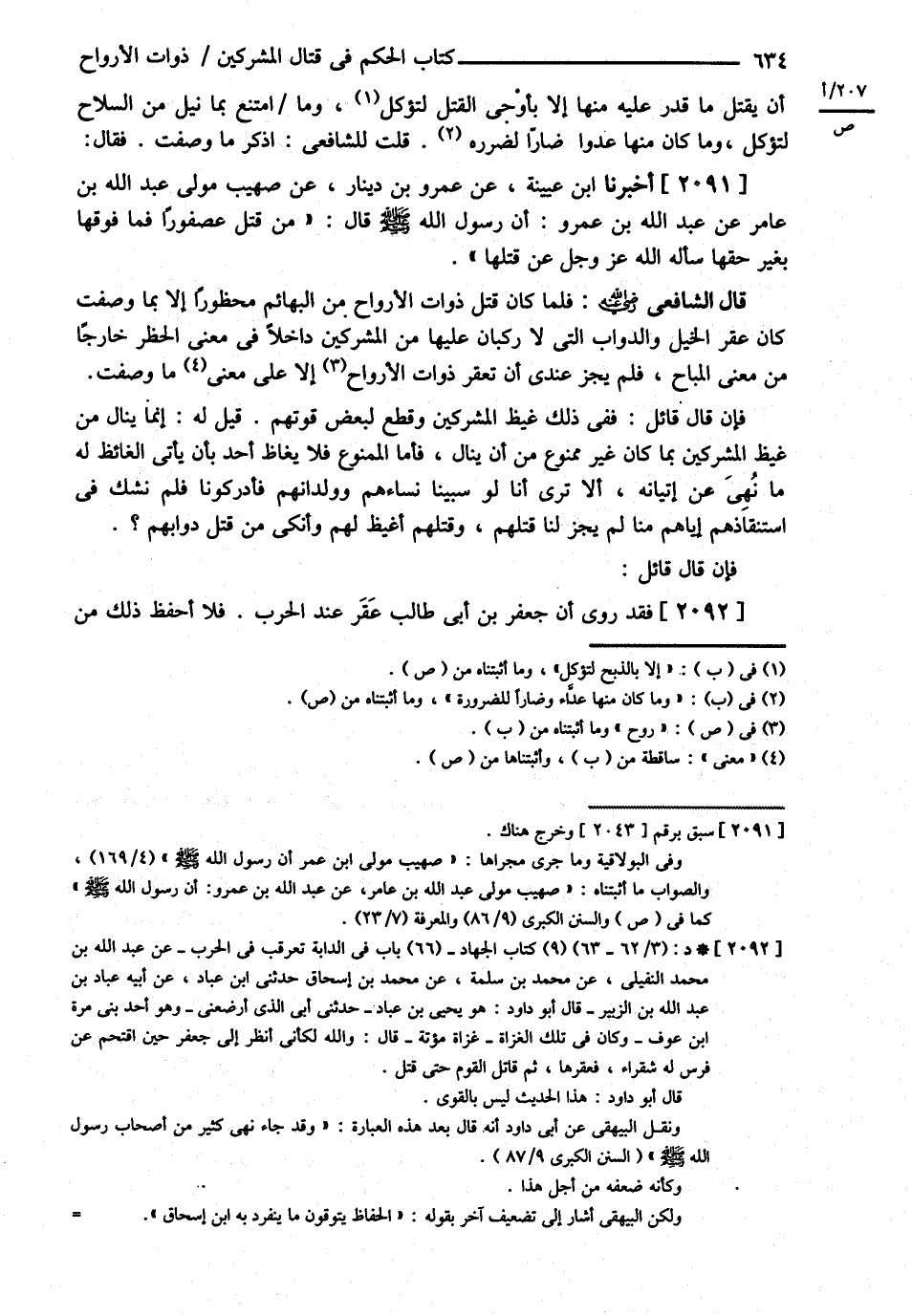 أَنْ يُقْتَلَ مَا قُدِرَ عَلَيْهِ مِنْهَا إلَّا بِالذَّبْحِ لِتُؤْكَلَ وَمَا امْتَنَعَ بِمَا نِيلَ مِنْ السِّلاَحِ لِتُؤْكَلَ وَمَا كَانَ مِنْهَا عَدَاءً وَضَارًّا لِلضَّرُورَةِ قُلْت لِلشَّافِعِيِّ : اُذْكُرْ مَا وَصَفْت فَقَالَ : أَخْبَرَنَا ابْنُ عُيَيْنَةَ عَنْ عَمْرِو بْنِ دِينَارٍ عَنْ صُهَيْبٍ مَوْلَى عَبْدِ اللَّهِ بْنِ عُمَرَ أَنَّ رَسُولَ اللَّهِ - صلى الله عليه وسلم - قَالَ { : مَنْ قَتَلَ عُصْفُورًا فَمَا فَوْقَهَا بِغَيْرِ حَقِّهَا سَأَلَهُ اللَّهُ عَزَّ وَجَلَّ عَنْ قَتْلِهَا }