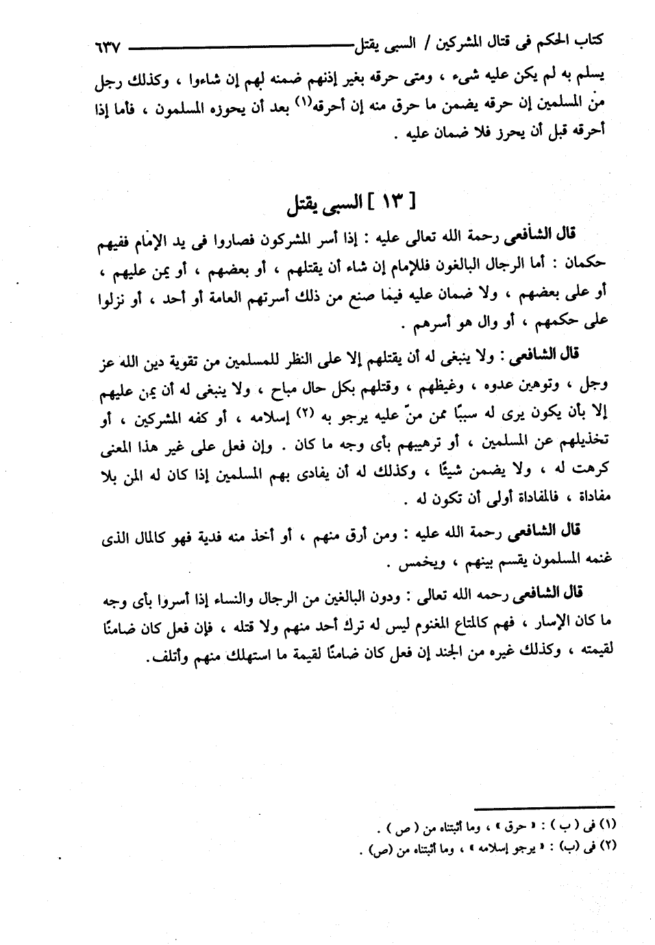 قَالَ الشَّافِعِيُّ : رحمه الله تعالى : إذَا أُسِرَ الْمُشْرِكُونَ فَصَارُوا فِي يَدِ الْإِمَامِ فَفِيهِمْ حُكْمَانِ , أَمَّا الرِّجَالُ الْبَالِغُونَ فَلِلْإِمَامِ إنْ شَاءَ أَنْ يَقْتُلَهُمْ أَوْ بَعْضَهُمْ أَوْ يَمُنَّ عَلَيْهِمْ أَوْ عَلَى بَعْضِهِمْ وَلاَ ضَمَانَ عَلَيْهِ فِيمَا صَنَعَ مِنْ ذَلِكَ أَسَرَتْهُمْ الْعَامَّةُ أَوْ أَحَدٌ أَوْ نَزَلُوا عَلَى حُكْمِهِمْ أَوْ وَالٍ هُوَ أَسَرَهُمْ