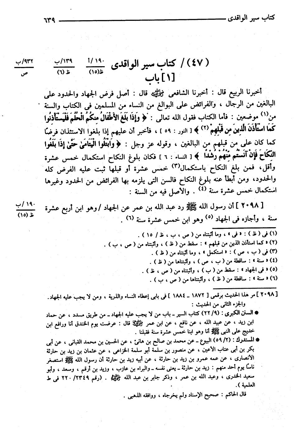 سِيَرُ الْوَاقِدِيِّ . ( أَخْبَرَنَا الرَّبِيعُ ) : قَالَ أَخْبَرَنَا الشَّافِعِيُّ رحمه الله تعالى قَالَ : أَصْلُ فَرْضِ الْجِهَادِ وَالْحُدُودِ عَلَى الْبَالِغِينَ مِنْ الرِّجَالِ وَالْفَرَائِضِ عَلَى البوالغ مِنْ النِّسَاءِ مِنْ الْمُسْلِمِينَ فِي الْكِتَابِ وَالسُّنَّةِ مِنْ مَوْضِعَيْنِ فَأَمَّا الْكِتَابُ فَقَوْلُ اللَّهِ تَعَالَى { وَإِذَا بَلَغَ الْأَطْفَالُ مِنْكُمْ الْحُلُمَ فَلْيَسْتَأْذِنُوا كَمَا اسْتَأْذَنَ الَّذِينَ مِنْ قَبْلِهِمْ } فَأَخْبَرَ أَنَّ عَلَيْهِمْ إذَا بَلَغُوا الِاسْتِئْذَانَ فَرْضًا كَمَا كَانَ عَلَى مَنْ قَبْلَهُمْ مِنْ الْبَالِغِينَ وَقَوْلُهُ عَزَّ وَجَلَّ : ? وَابْتَلُوا الْيَتَامَى حَتَّى إذَا بَلَغُوا النِّكَاحَ فَإِنْ آنَسْتُمْ مِنْهُمْ رُشْدًا } وَكَانَ بُلُوغُ النِّكَاحِ اسْتِكْمَالَ خَمْسَ عَشَرَةَ وَأَقَلَّ فَمَنْ بَلَغَ النِّكَاحَ اسْتَكْمَلَ خَمْسَ عَشَرَةَ أَوْ قَبْلَهَا ثَبَتَ عَلَيْهِ الْفَرْضُ كُلُّهُ وَالْحُدُودُ وَمَنْ أَبْطَأَ عَنْهُ بُلُوغُ النِّكَاحِ فَالسِّنُّ الَّتِي يَلْزَمُهُ بِهَا الْفَرَائِضُ مِنْ الْحُدُودِ وَغَيْرِهِمَا اسْتِكْمَالُ خَمْسَ عَشَرَةَ وَالْأَصْلُ فِيهِ مِنْ السُّنَّةِ { أَنَّ رَسُولَ اللَّهِ - صلى الله عليه وسلم - رَدَّ عَبْدَ اللَّهِ بْنَ عُمَرَ عَنْ الْجِهَادِ وَهُوَ ابْنُ أَرْبَعَ عَشَرَةَ سَنَةً وَأَجَازَهُ وَهُوَ ابْنُ خَمْسَ عَشَرَةَ سَنَةً @