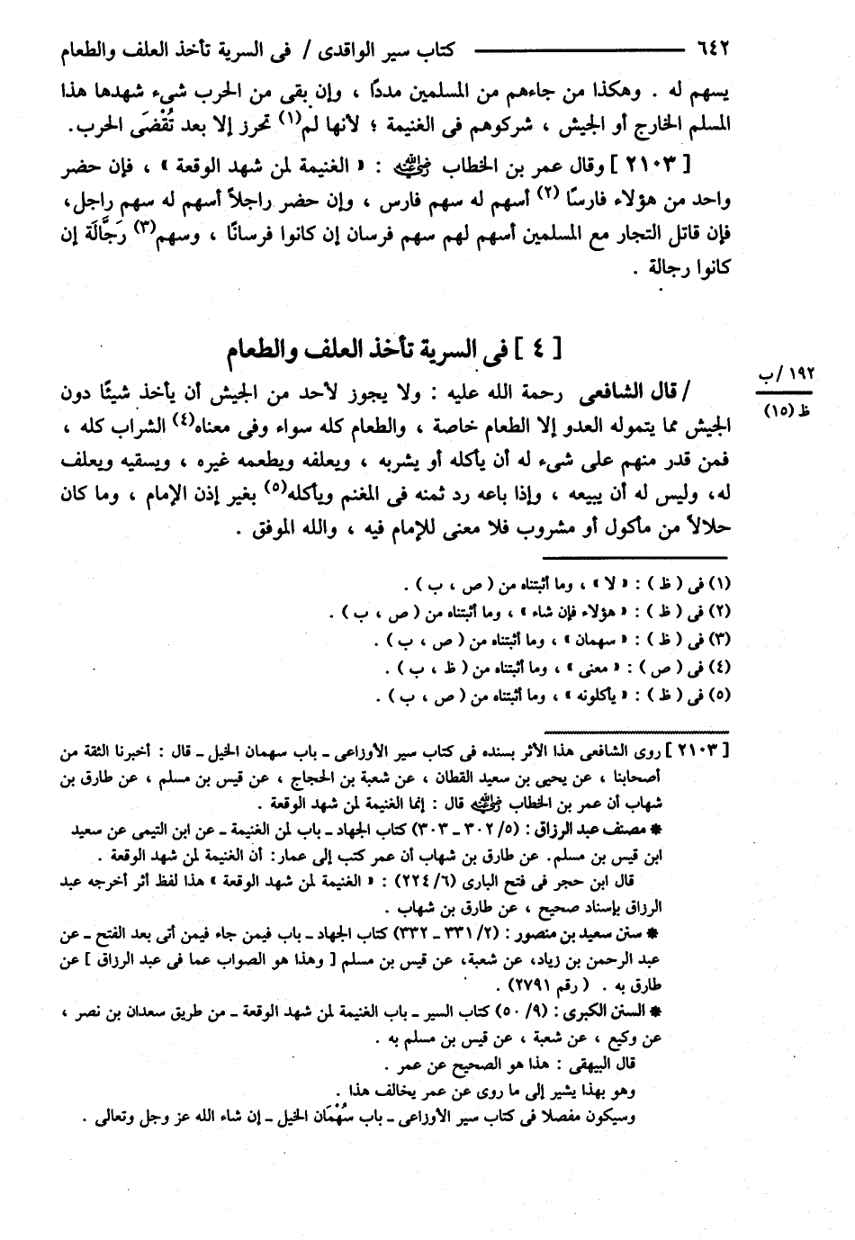 قَالَ الشَّافِعِيُّ : رحمه الله تعالى : وَلاَ يَجُوزُ لِأَحَدٍ مِنْ الْجَيْشِ أَنْ يَأْخُذَ شَيْئًا دُونَ الْجَيْشِ مِمَّا يَتَمَوَّلُهُ الْعَدُوُّ إلَّا الطَّعَامَ خَاصَّةً وَالطَّعَامُ كُلُّهُ سَوَاءٌ وَفِي مَعْنَاهُ الشَّرَابُ كُلُّهُ فَمَنْ قَدَرَ مِنْهُمْ عَلَى شَيْءٍ لَهُ أَنْ يَأْكُلَهُ أَوْ يُشْرِبَهُ وَيَعْلِفَهُ وَيُطْعِمَهُ غَيْرَهُ وَيَسْقِيَهُ وَيَعْلِفَ لَهُ وَلَيْسَ لَهُ أَنْ يَبِيعَهُ وَإِذَا بَاعَهُ رَدَّ ثَمَنَهُ فِي الْمَغْنَمِ وَيَأْكُلُهُ بِغَيْرِ إذْنِ الْإِمَامِ وَمَا كَانَ حَلاَلاً مِنْ مَأْكُولٍ أَوْ مَشْرُوبٍ فَلاَ مَعْنَى لِلْإِمَامِ فِيهِ وَاَللَّهُ تَعَالَى أَعْلَمُ .@